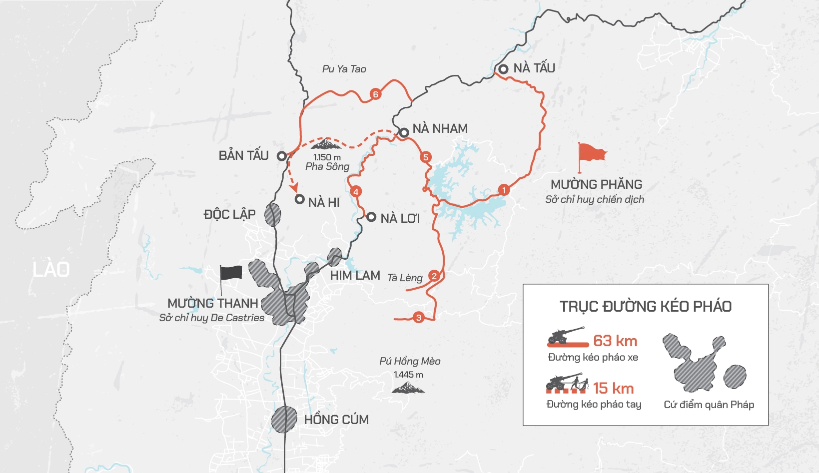 Các nét vẽ tương đương những trục đường cơ động cho xe kéo pháo vào mặt trận, di chuyển trong chiến đấu lần lượt vạch ra trên bản đồ, vắt qua núi đồi từ đông sang phía bắc Mường Thanh. Đường đủ rộng cho xe pháo đi và tuyệt đối bí mật bởi đều nằm trong tầm bắn của pháo Pháp.