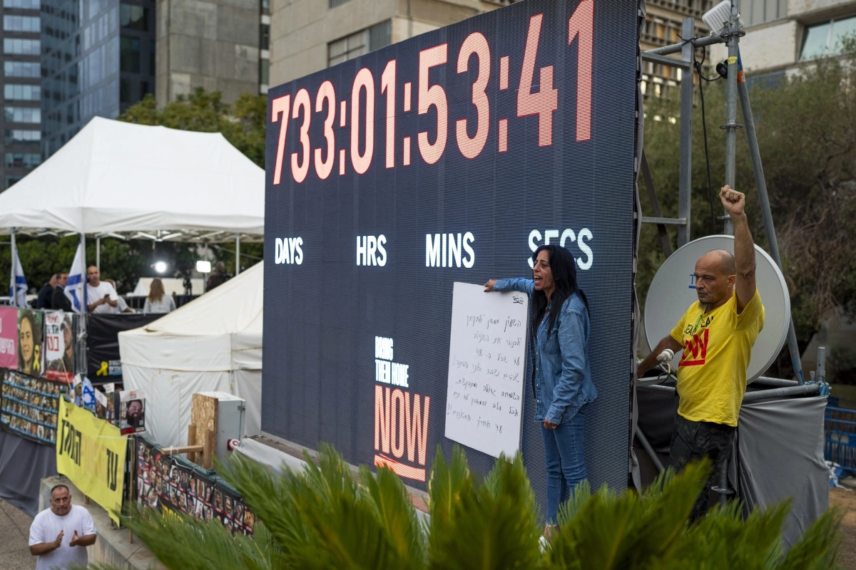 Einav Zangauker (áo xanh), mẹ của con tin Matan Zanzauker, đứng trước đồng hồ chỉ thời gian hơn 733 ngày các con tin bị giam giữ.