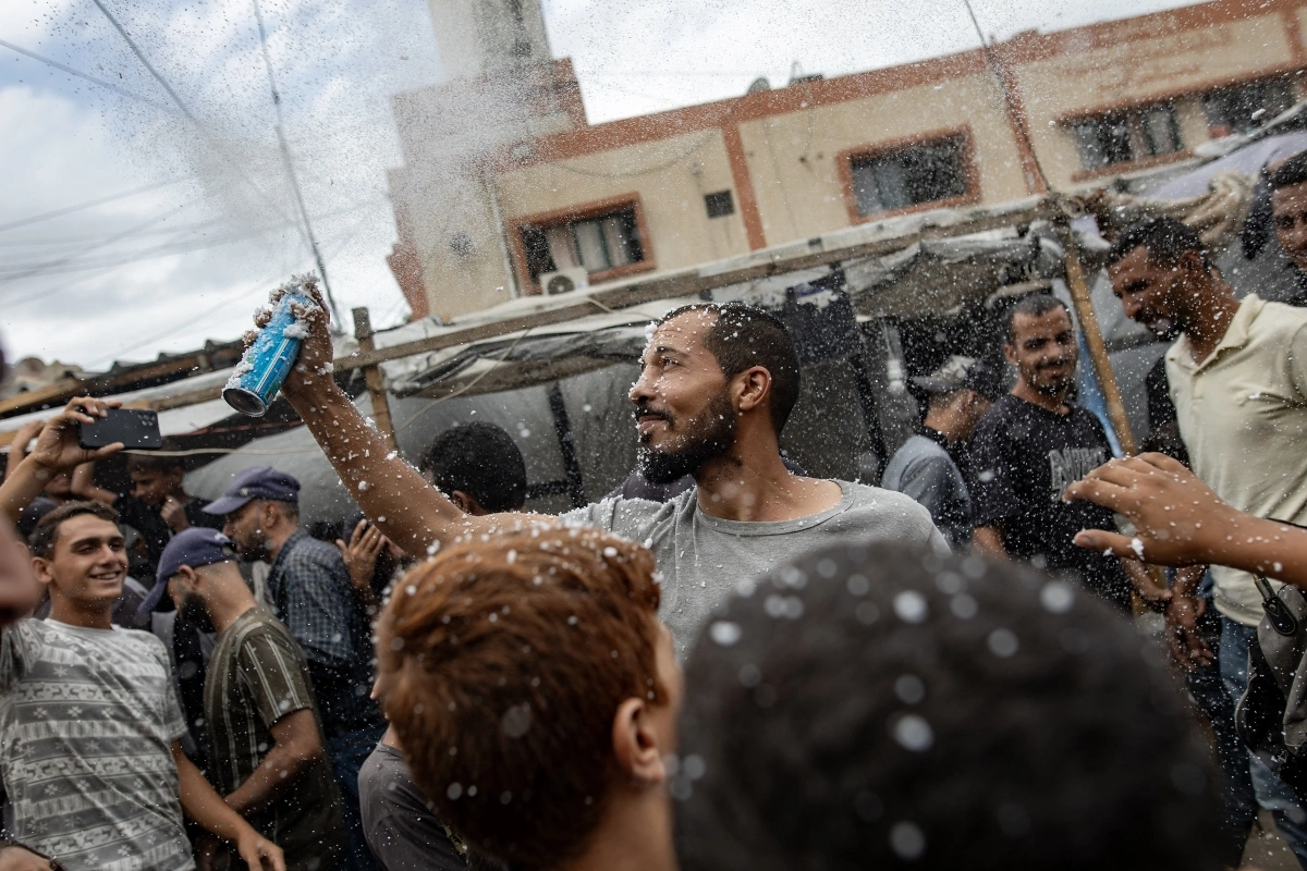 Người đàn ông ở Khan Younis xịt bọt tuyết lên trời, bày tỏ niềm vui trong ngày xác lập thỏa thuận hòa bình.