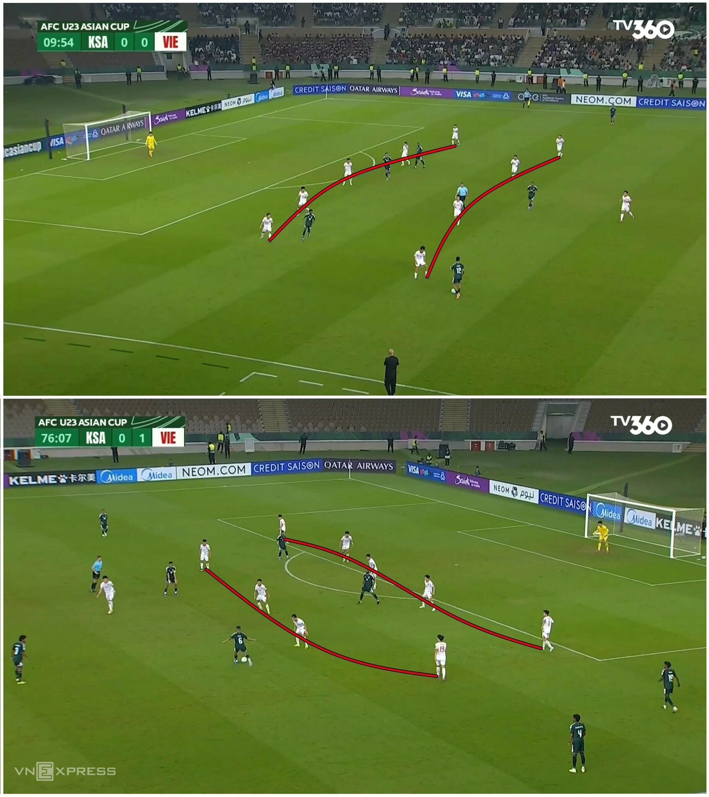 Một vấn đề khác là việc đối thủ áo xanh không đủ biến hóa và nguy hiểm ở những tình huống khai thác khoảng trống giữa hai tuyến của Việt Nam. Cụ thể, khi cầu thủ len lỏi vào không gian này, họ không có những mũi công tích cực tấn công chiều sâu để tận dụng khoảng trống sau lưng trung vệ dâng lên dập bóng của Việt Nam. Nói cách khác, tổ hợp tấn công theo mô hình di chuyển "song song nghịch hướng" của Arab Saudi là hạn chế.