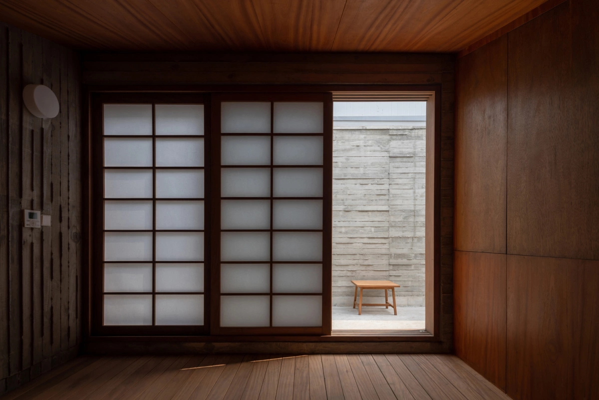 Cửa trượt kết hợp sàn gỗ và tường gạch thô tạo lớp chuyển tiếp nhẹ giữa không gian ở và sân nhỏ, gợi cảm hứng từ kiến trúc Nhật.