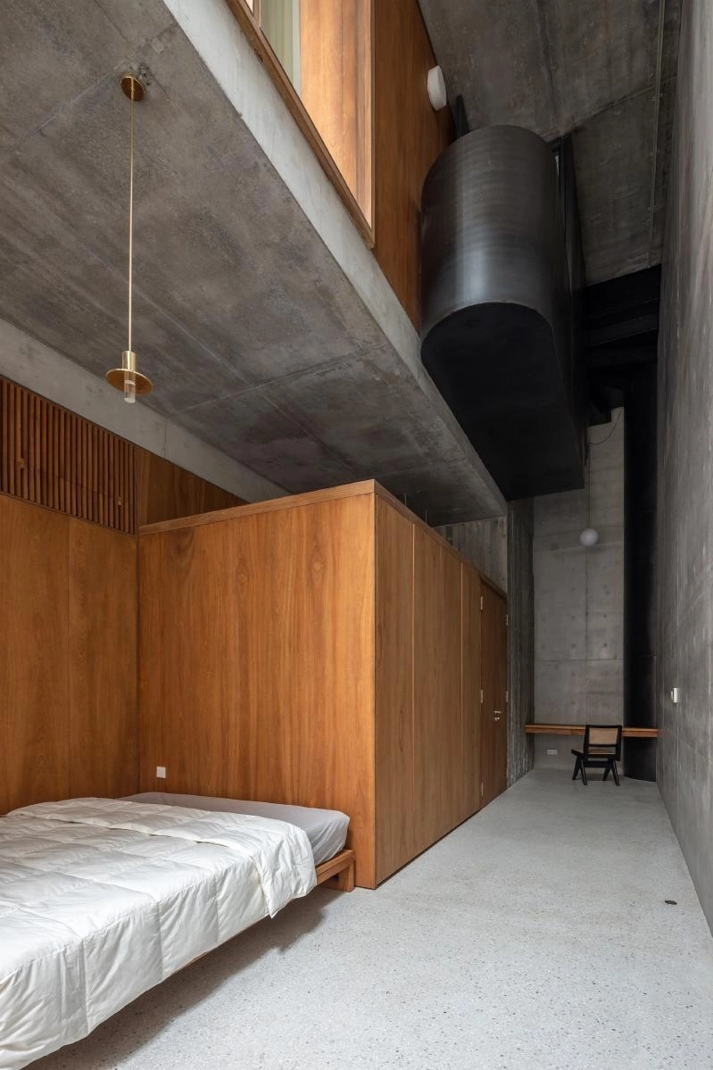 Hai không gian ngủ kết nối dọc qua các khoảng rỗng chung, nơi âm thanh, ánh sáng và luồng khí mát lưu chuyển tự nhiên, vừa đảm bảo tuần hoàn nhiệt vừa giữ được sự gắn kết trong sinh hoạt.