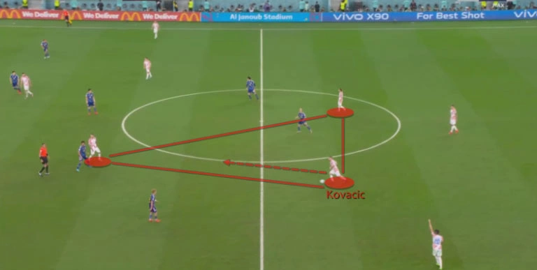 Một giải pháp khác của Croatia là đưa Kovacic, một người mạnh ở khả năng kéo bóng, lùi về để đưa quả bóng lên trên phần sân Nhật Bản.