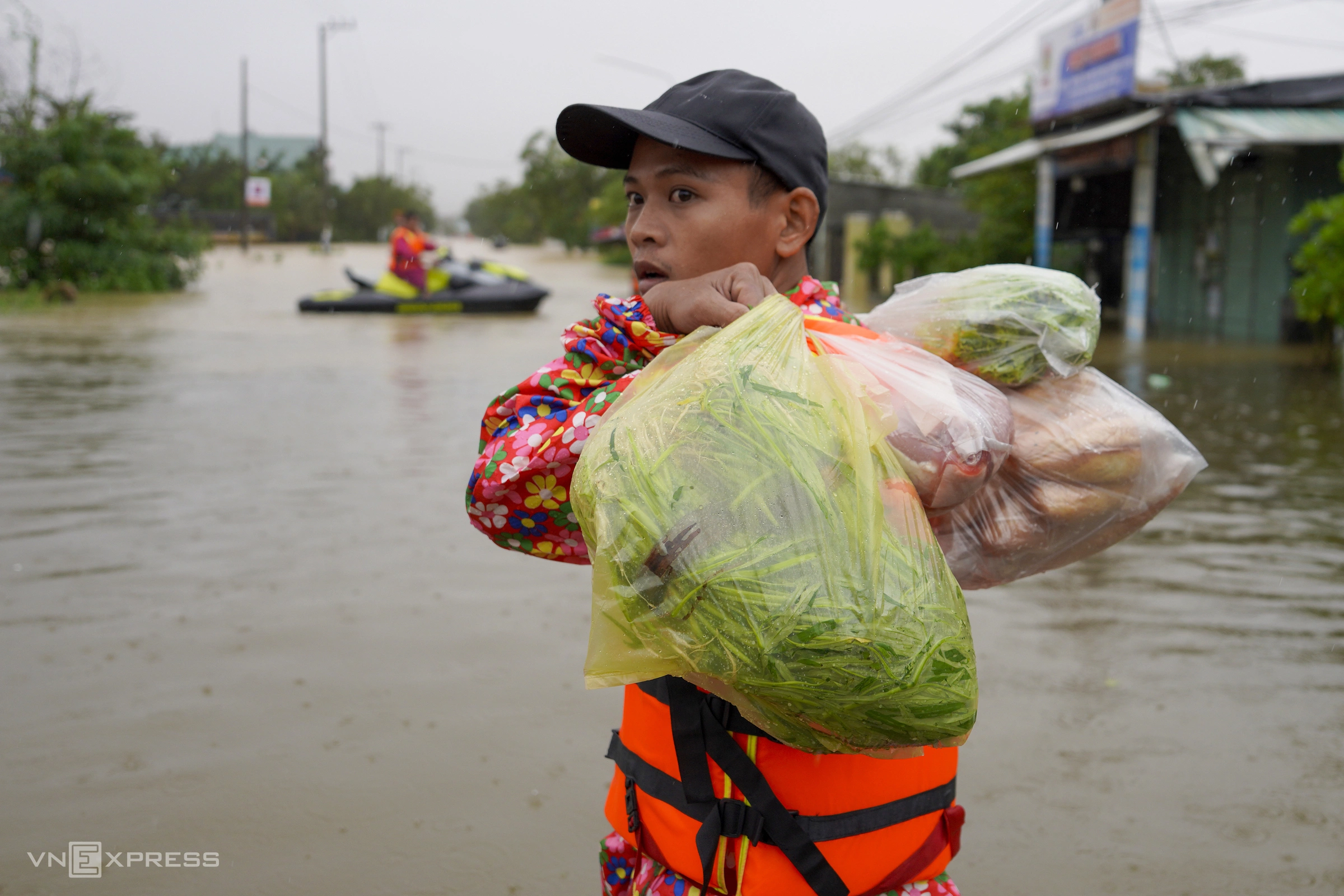 Người dân phường Điện Bàn Đông nhờ xuồng cứu hộ ra khu vực cao ráo trên đường Trần Thụ Độ mua thực phẩm, sau đó lại chờ xuồng để về nhà. Anh Độ đã mua hơn một kg thịt lợn, gần chục ổ bánh mì, vài mớ rau.
