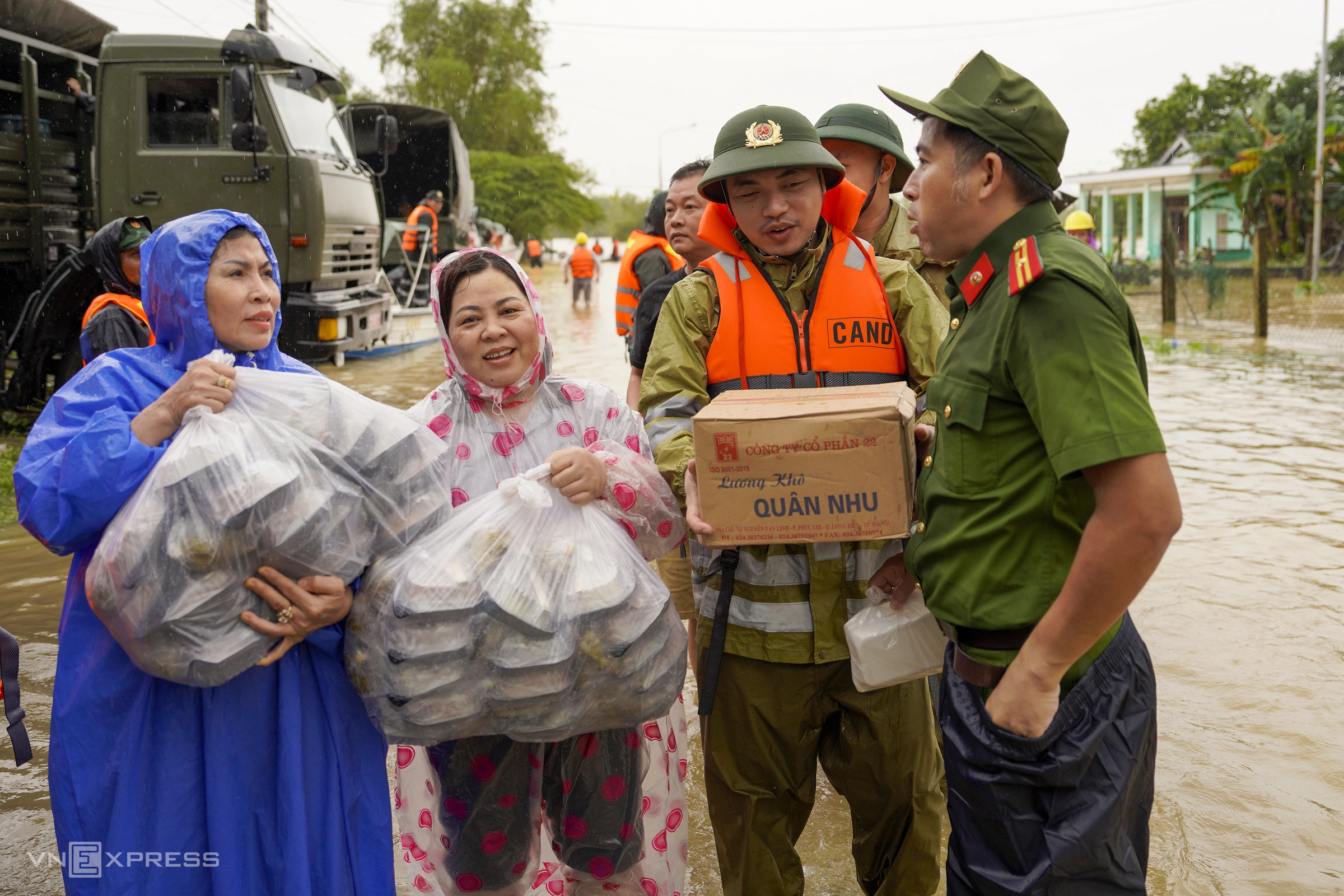 Nhiều người dân chuẩn bị sẵn cơm để nhờ công an, quân đội tại điểm cứu trợ đầu đường DH9 chuyển vào cho các bệnh nhân hai Bệnh viện Đa khoa Bắc Quảng Nam, Bệnh viện Vĩnh Đức ở phường Điện Bàn và Điện Bàn Đông, cùng lực lượng làm nhiệm vụ trong vùng rốn lũ.