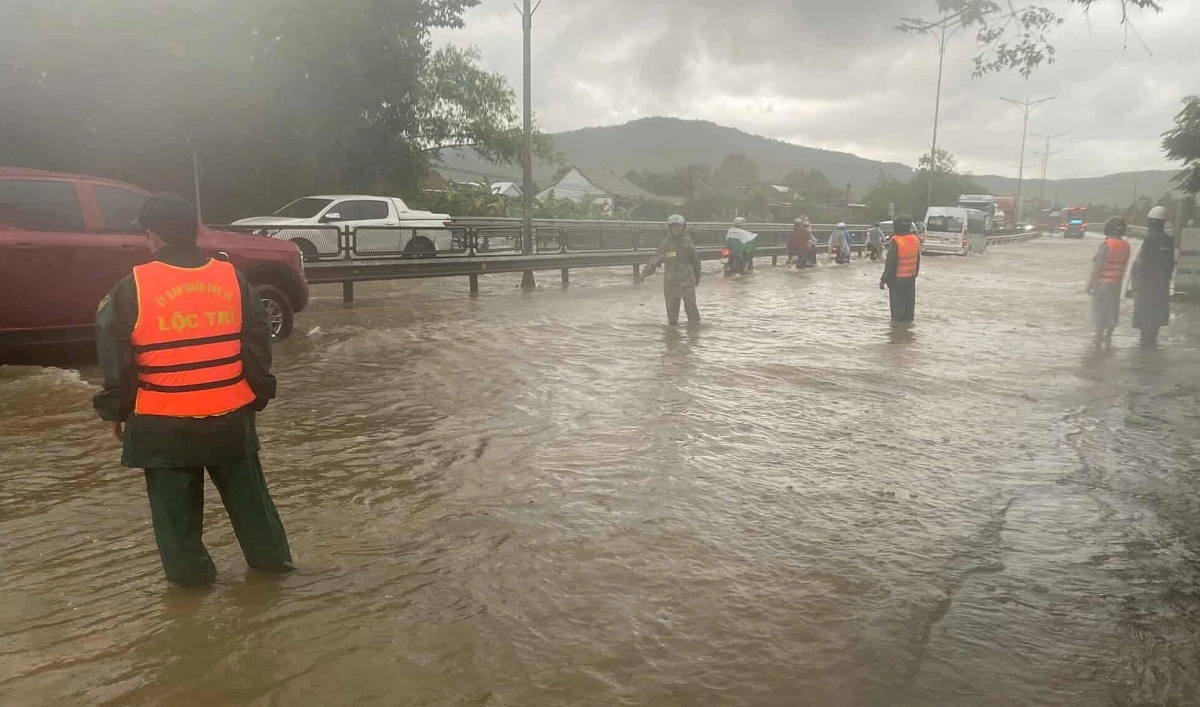 Mưa kéo dài cũng khiến nhiều nơi ở TP Huế ngập sâu. Đáng chú ý nhất là quốc lộ 1 đoạn qua xã Phú Lộc ngập hơn 30 cm, kéo dài khoảng nửa cây số, xe đi qua khu vực gặp khó khăn. Chính quyền phải cử người ra phân luồng bảo đảm an toàn.