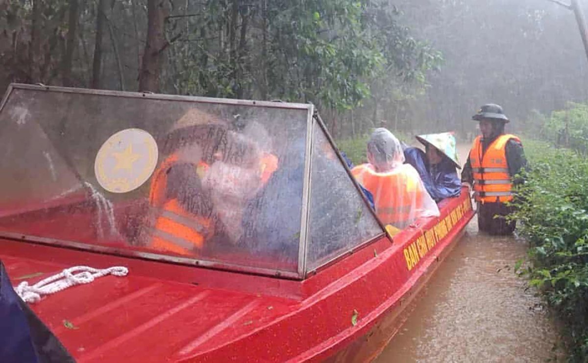 Lực lượng chiến sĩ Ban chỉ huy phòng thủ dân sự khu vực 3 - Phú Lộc hỗ trợ di dời người dân bị ngập sâu.