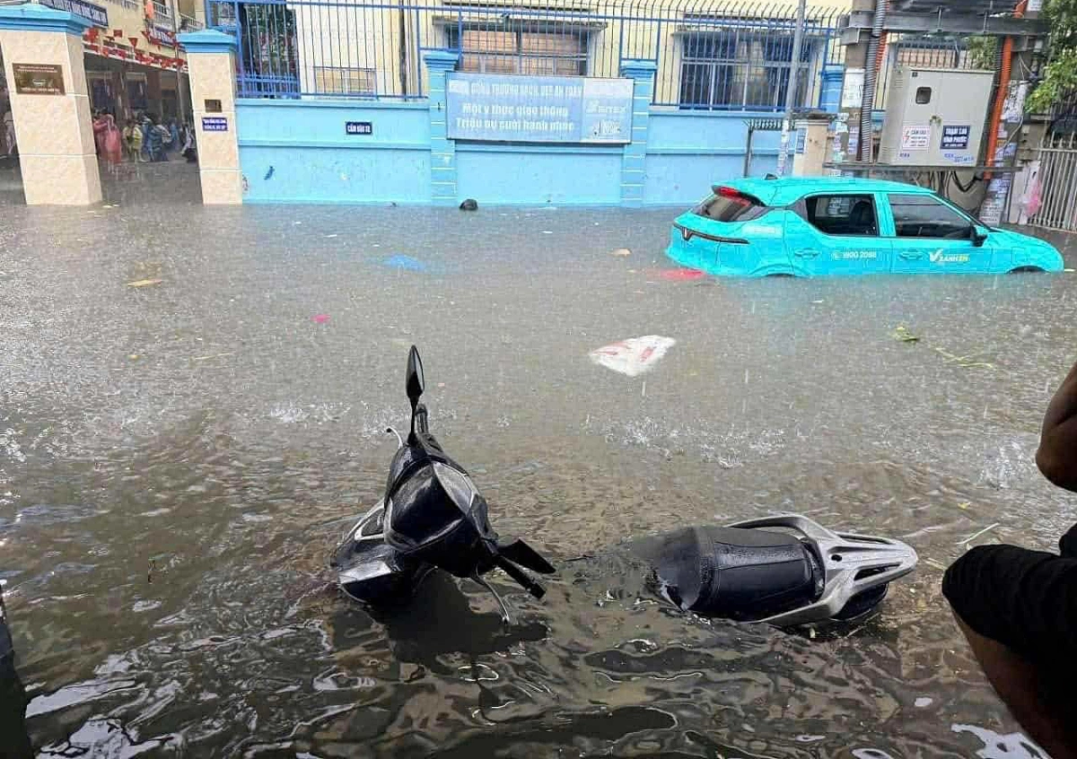 Khu vực đường Ngô Đến, gần trường THCS Nguyễn Khuyến, ngập hơn 50 cm. Do đường nhỏ, nằm ở vùng trũng, nước dâng ngập cả xe máy và ôtô. Nhiều phụ huynh phải cho con ở nhà để đảm bảo an toàn.