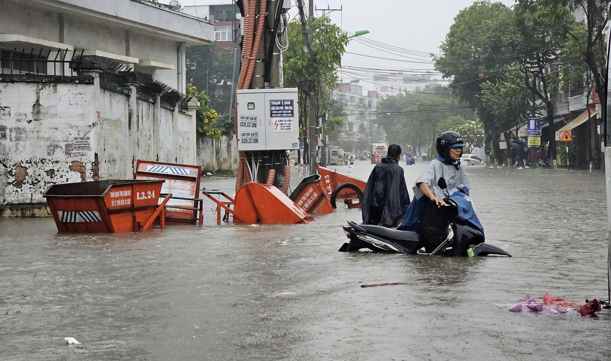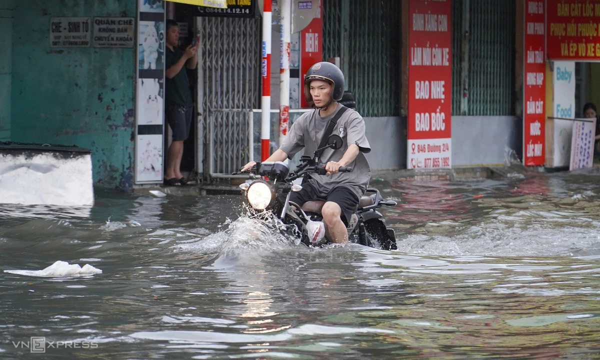 Mưa kéo dài làm nhiều tuyến đường ở đô thị biển, tập trung nhiều khách du lịch nước ngoài, bị ngập 35-60 cm. Một người chạy xe máy qua khu vực ngập gần nửa mét.
