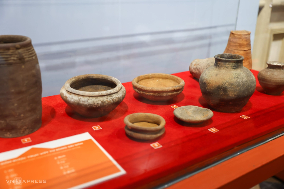 Góc trái là hai chiếc bình và hũ gốm Khmer niên đại thế kỷ 18, 19. Bên phải là chiếc bát và đĩa chiếu yêu do người Việt chế tác, thế kỷ 19.