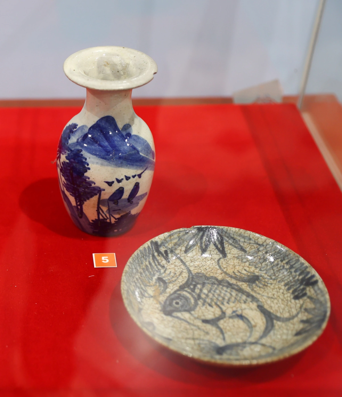 Bình hoa và dĩa men xanh trắng thế kỷ 19, 20 vẫn còn khá nguyên vẹn sau thời gian dài.