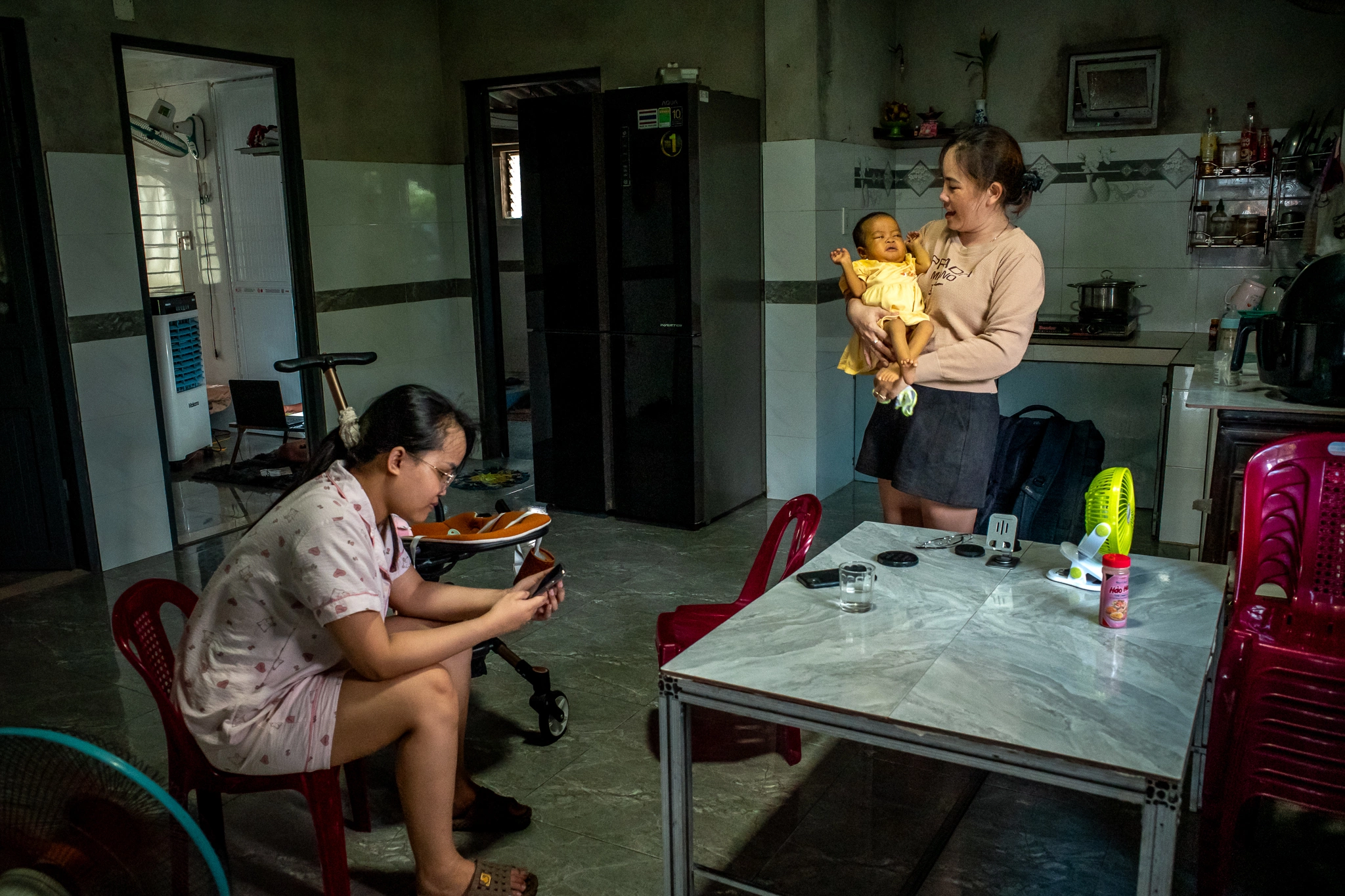 Chị Hồ Thị Giang (23 tuổi) chơi đùa cùng con gái Huỳnh Ngọc Châu (7 tháng tuổi).