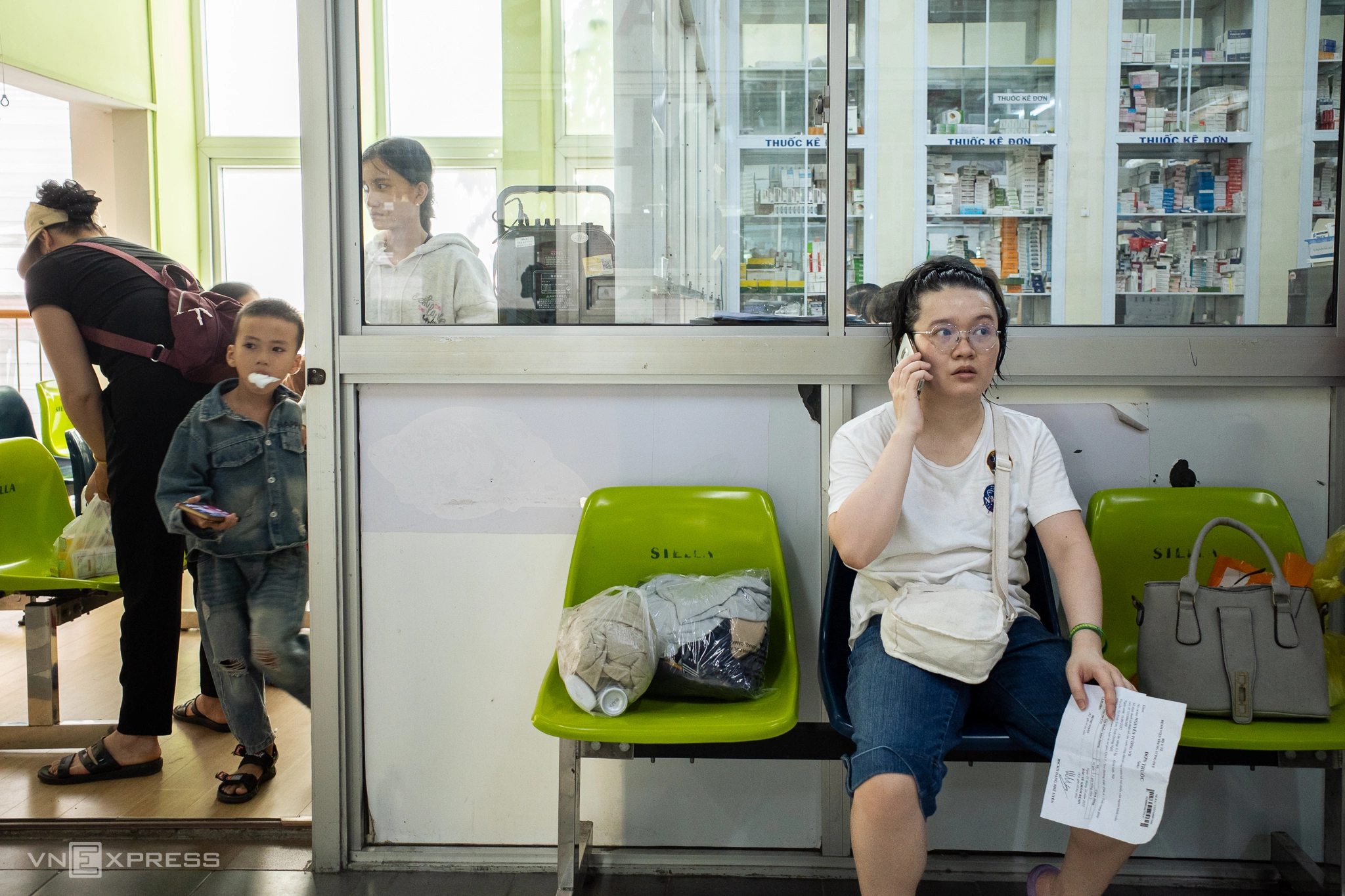 Chị Võ Thị Mỹ (32 tuổi, Quảng Ngãi) chờ lấy thuốc cho con tại Bệnh viện Trung ương Huế.