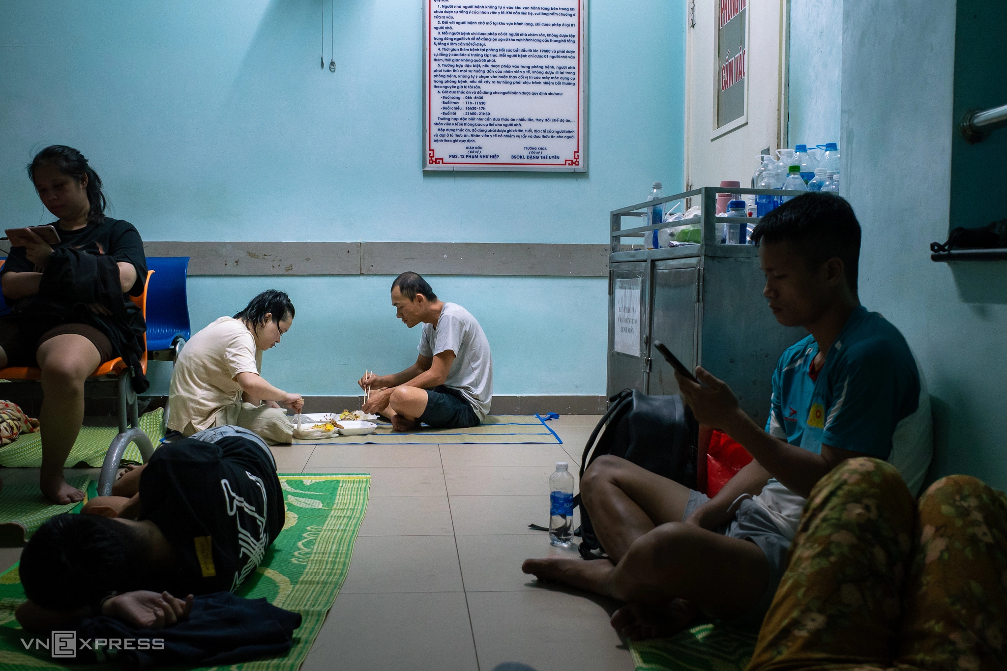 Để tiết kiệm chi phí sau ca ghép của con, vợ chồng chị Mỹ không thuê nhà trọ mà ở tạm tại sảnh Trung tâm Tim mạch, nơi bệnh viện hỗ trợ cho người nhà sau giờ hành chính.