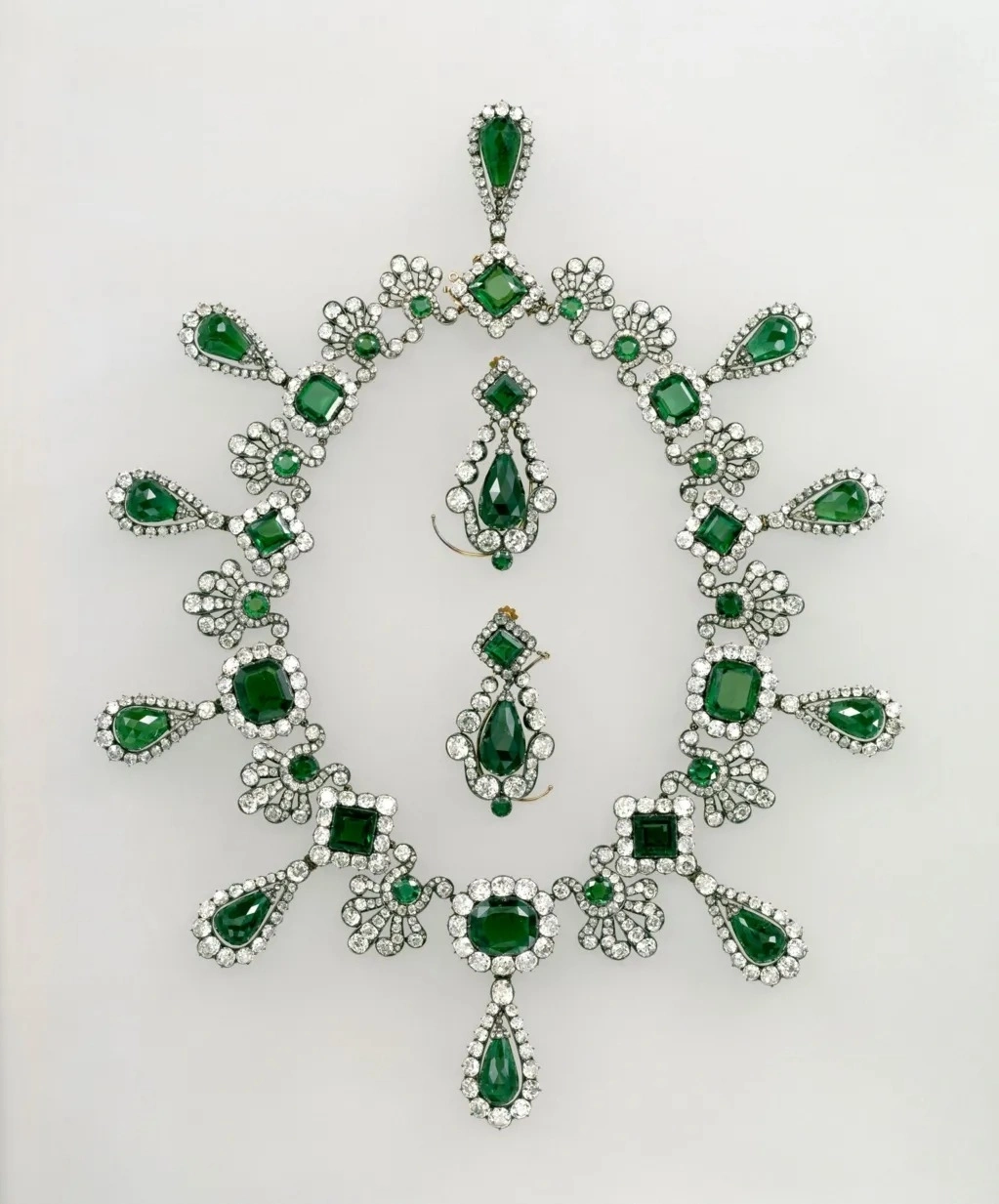 Trong ảnh là bộ bị lấy trộm khỏi bảo tàng, bao gồm vòng cổ gắn 32 viên ngọc lục bảo, nạm 1.138 viên kim cương, cùng đôi bông tai cũng nạm ngọc lục bảo và kim cương.