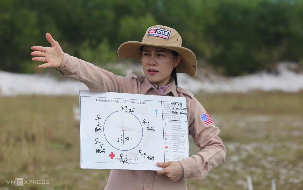 Mỗi khi xử lý vật liệu nổ đều tuân theo quy trình của MAG. Đội trưởng Võ Thị Ry đứng giữa nắng, cầm bảng vị trí để các thành viên khác cầm loa tỏa đi các hướng, cảnh báo người dân có vụ nổ sắp xảy ra, tránh vùng nguy hiểm.