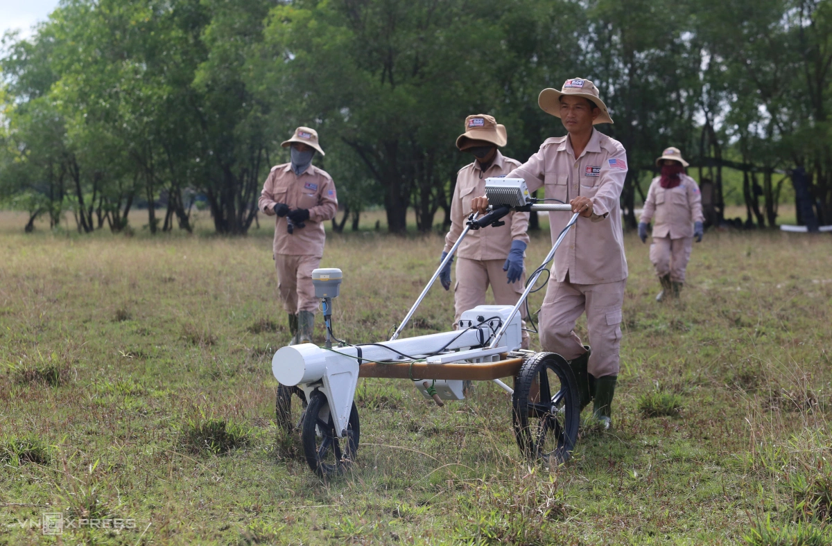 Anh Phùng Minh Thành, nhân viên kỹ thuật đội MAT99, đẩy máy cùng đồng nghiệp ra hiện trường. Loại máy này được kết nối vệ tinh, dẫn dữ liệu về máy tính. Mỗi khi máy đi qua gặp bom mìn sẽ truyền tín hiệu về máy tính để thông báo.