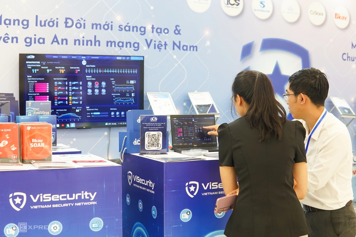 Tại gian hàng của Mạng lưới An ninh mạng, một trong những nhóm lĩnh vực được quan tâm hàng đầu hiện nay, nhiều giải pháp do kỹ sư Việt phát triển được trình diễn.