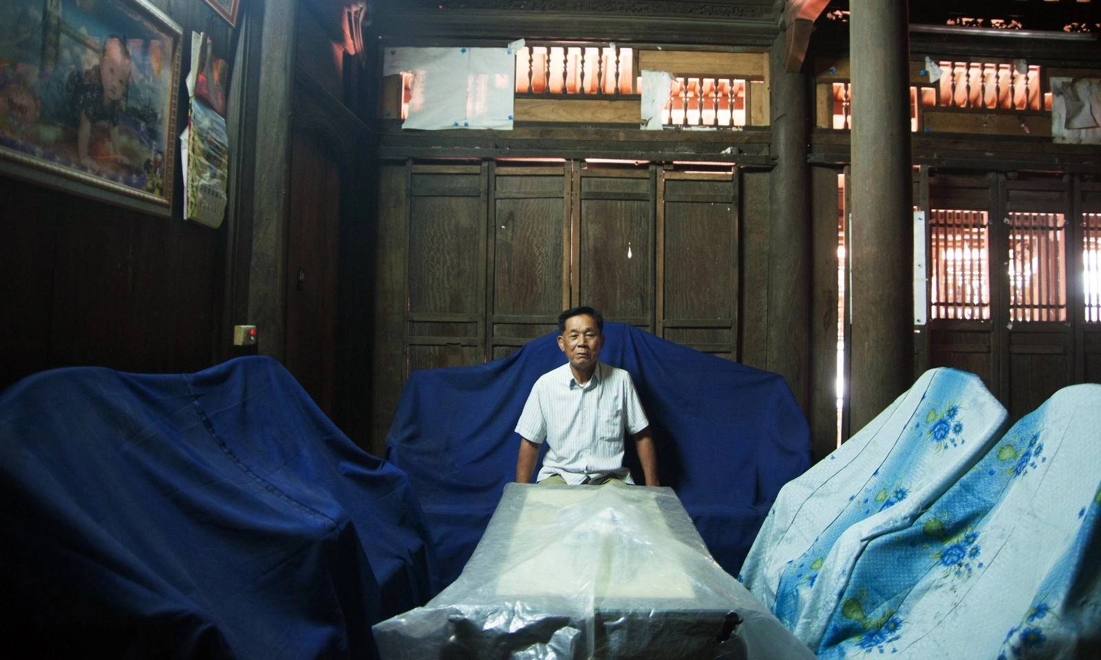 Nhà của trưởng thôn Mẫn Văn Tán che một tấm bạt xanh lớn trước cửa chính. Ông Tán mở hé cửa đón khách vào, rồi lại đóng chặt ngay. Ông kéo nửa tấm bạt phủ tràng kỷ ra để mình ngồi, kéo nửa tấm bạt ở ghế đối diện mời khách rồi lật một tấm che mặt bàn để tìm bộ ấm pha trà. Đồ đạc trong căn nhà này đều được đậy điệm kỹ càng như thế.