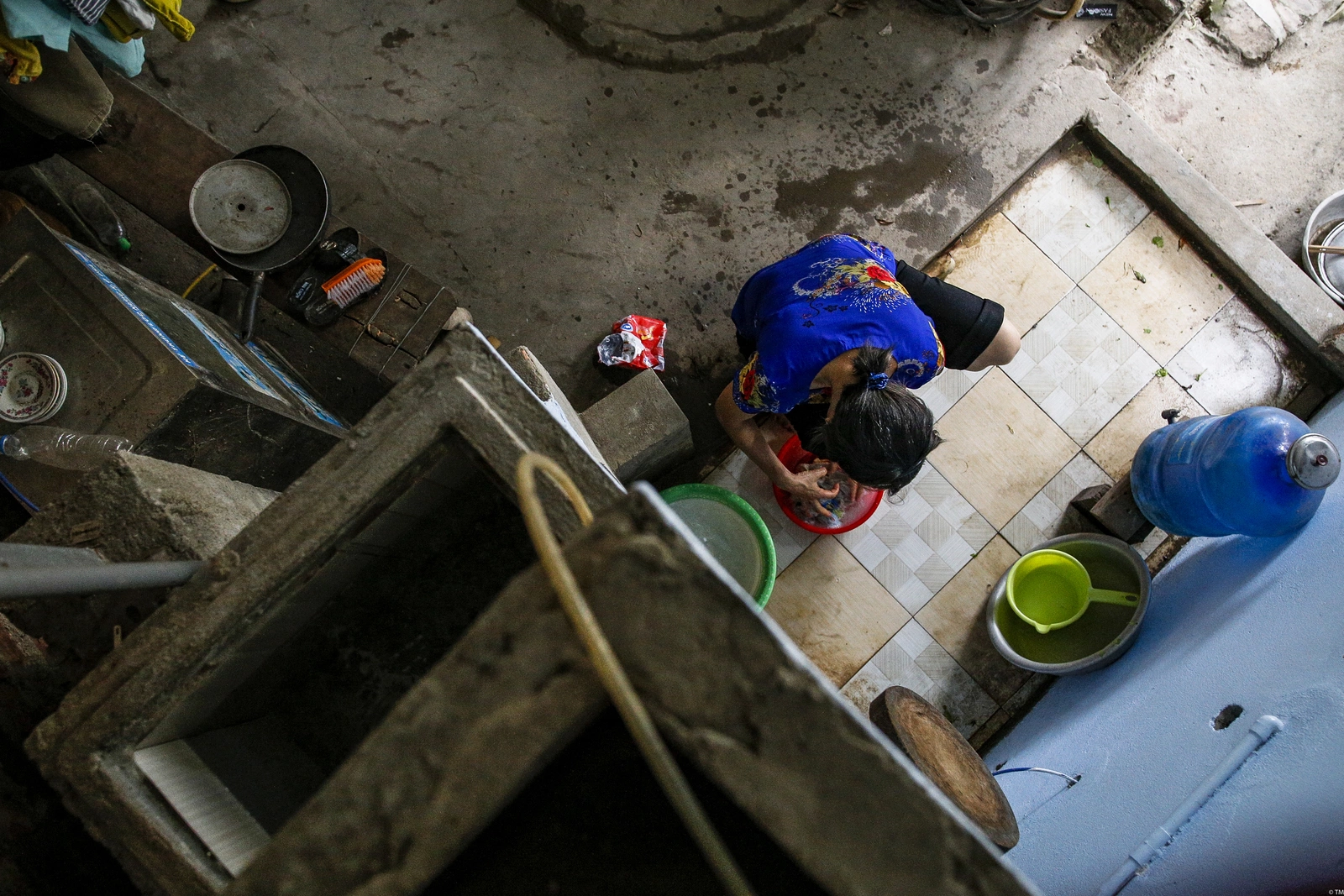 Thắm giờ sống bằng nghề đan mây tre giang và làm phụ bếp trong khu công nghiệp. 20 nghìn kiếm được mỗi ngày từ nghề thủ công truyền thống của làng, chỉ vừa đủ mua một bình nước loại 20 lít, để nấu ăn và đun lên uống. Ba năm nay, chị phải chi mỗi tháng 600 nghìn đồng chỉ để đổi lấy nước ăn, sau khi giếng đào trong nhà mất nước, phải dùng nước giếng làng và chưa vay được tiền khoan giếng mới.