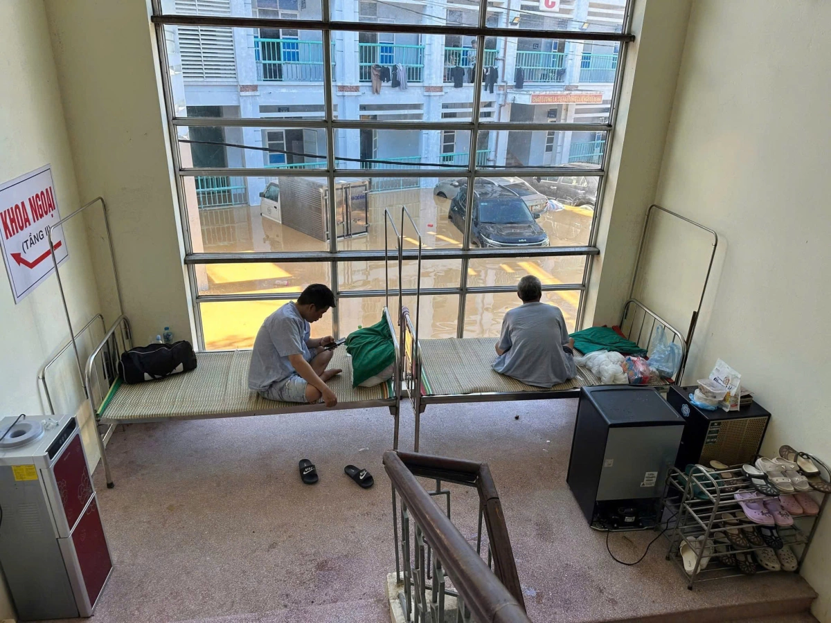 Các bệnh nhân được di chuyển lên tầng trên nằm tạm, bệnh viện đảm bảo công tác khám chữa bệnh. Ngoài đường phố, nước lụt vẫn còn ngập lênh láng. Ảnh: Bệnh viện cung cấp