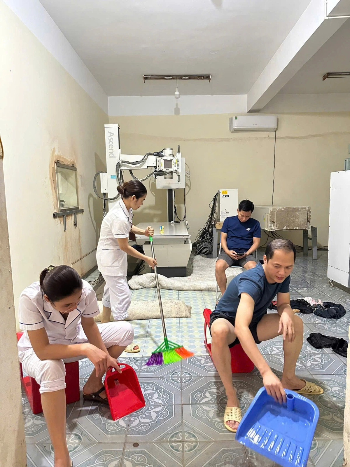 Ở những khu vực nước vừa rút, các nhân viên y tế bắt tay vào dọn dẹp vệ sinh môi trường. Lãnh đạo Sở Y tế Thái Nguyên cho biết ngành y tế đang tập trung chống ngập, chưa có thống kê đầy đủ về thiệt hại. Tuy nhiên, thống kê sơ bộ cho thấy nhiều thiết bị quan trọng như máy chụp CT, X-quang, siêu âm và hệ thống xét nghiệm đã bị hỏng do ngập nước. Ảnh: Bệnh viện cung cấp