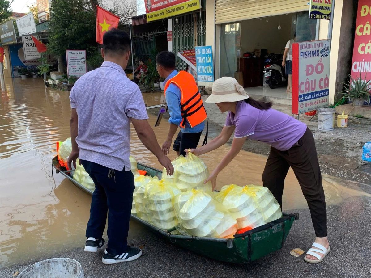 Thuyền cứu hộ chở đồ ăn vào bệnh viện tiếp tế. Lạng Sơn là địa phương đang hứng chịu lượng mưa rất lớn trong những ngày qua. Nước đổ về hồ thủy điện gây áp lực cho thân đập. Đập Bắc Khê 1 cách Hữu Lũng khoảng 100 km chiều hai hôm trước bị vỡ, nước ào ạt tràn xuống hạ du gây ngập nặng các nơi. Ảnh: Bệnh viện cung cấp