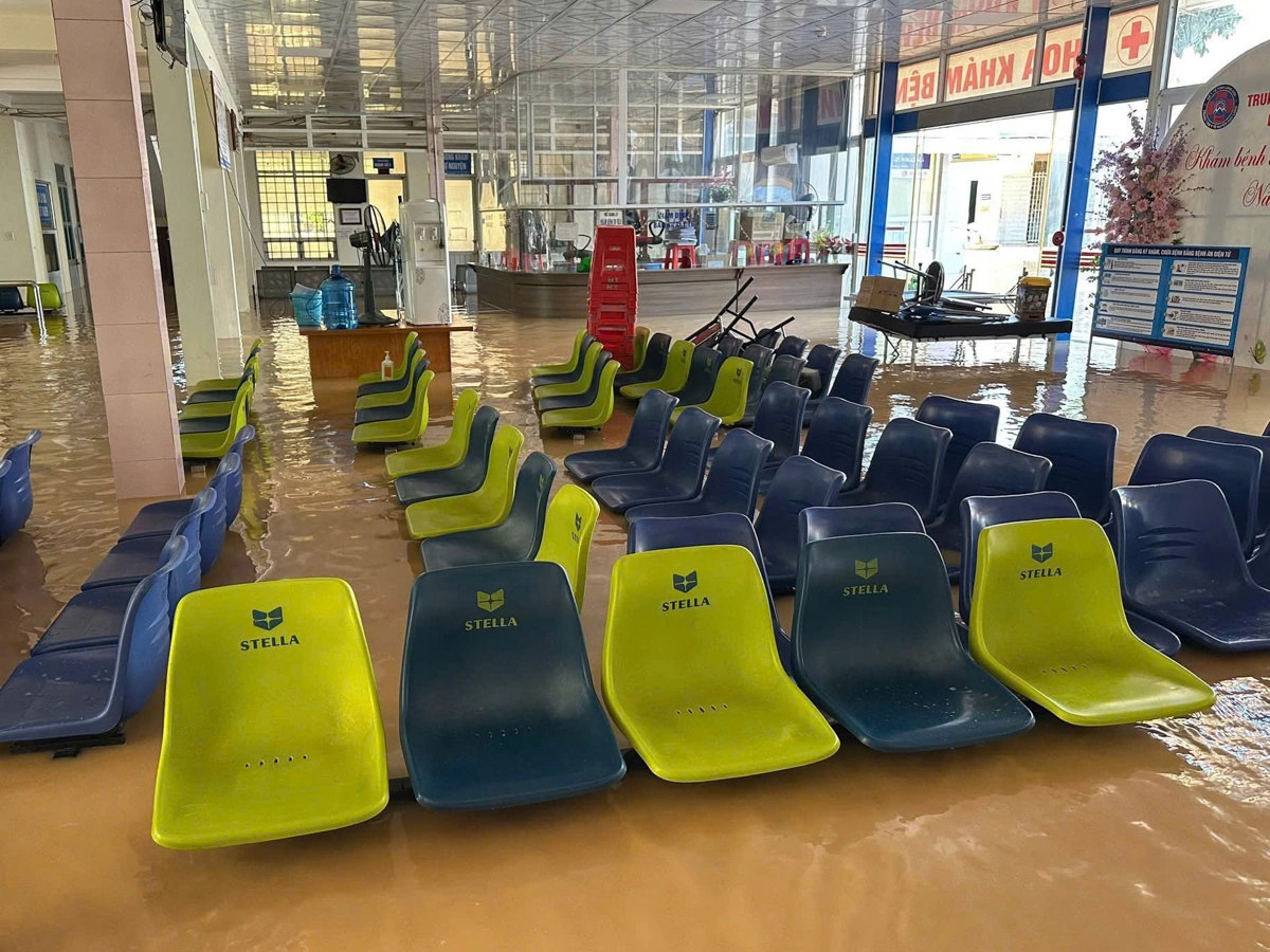 Trung tâm Y tế khu vực Hữu Lũng, Lạng Sơn, bị ngập và cô lập hoàn toàn những ngày qua. Đến sáng nay, nước rút bớt nhưng chưa đáng kể. Trong ảnh là Khoa Khám bệnh vẫn bị ngập. Các đoàn cứu trợ lương thực vẫn phải hỗ trợ bệnh viện. Ảnh: Bệnh viện cung cấp