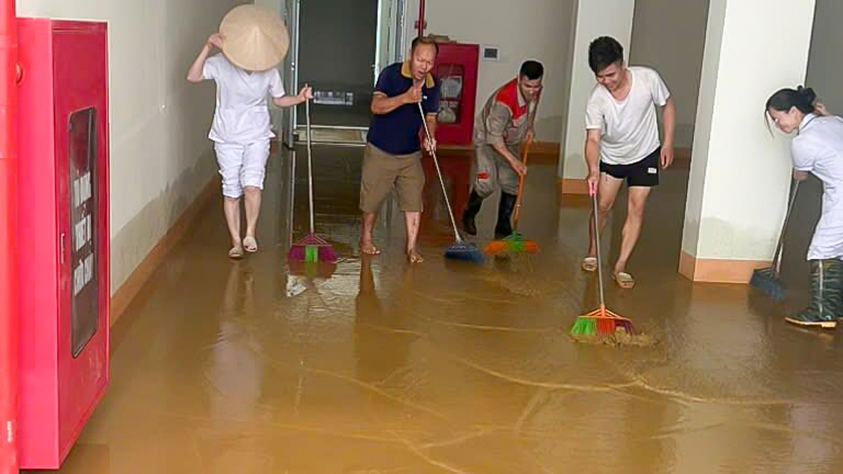 Một số khu vực nước rút dần, suốt đêm qua và sáng nay nhân viên y tế tập trung dọn dẹp. "Nước rút đến đâu, chúng tôi dọn dẹp đến đó", đại diện bệnh viện cho hay.