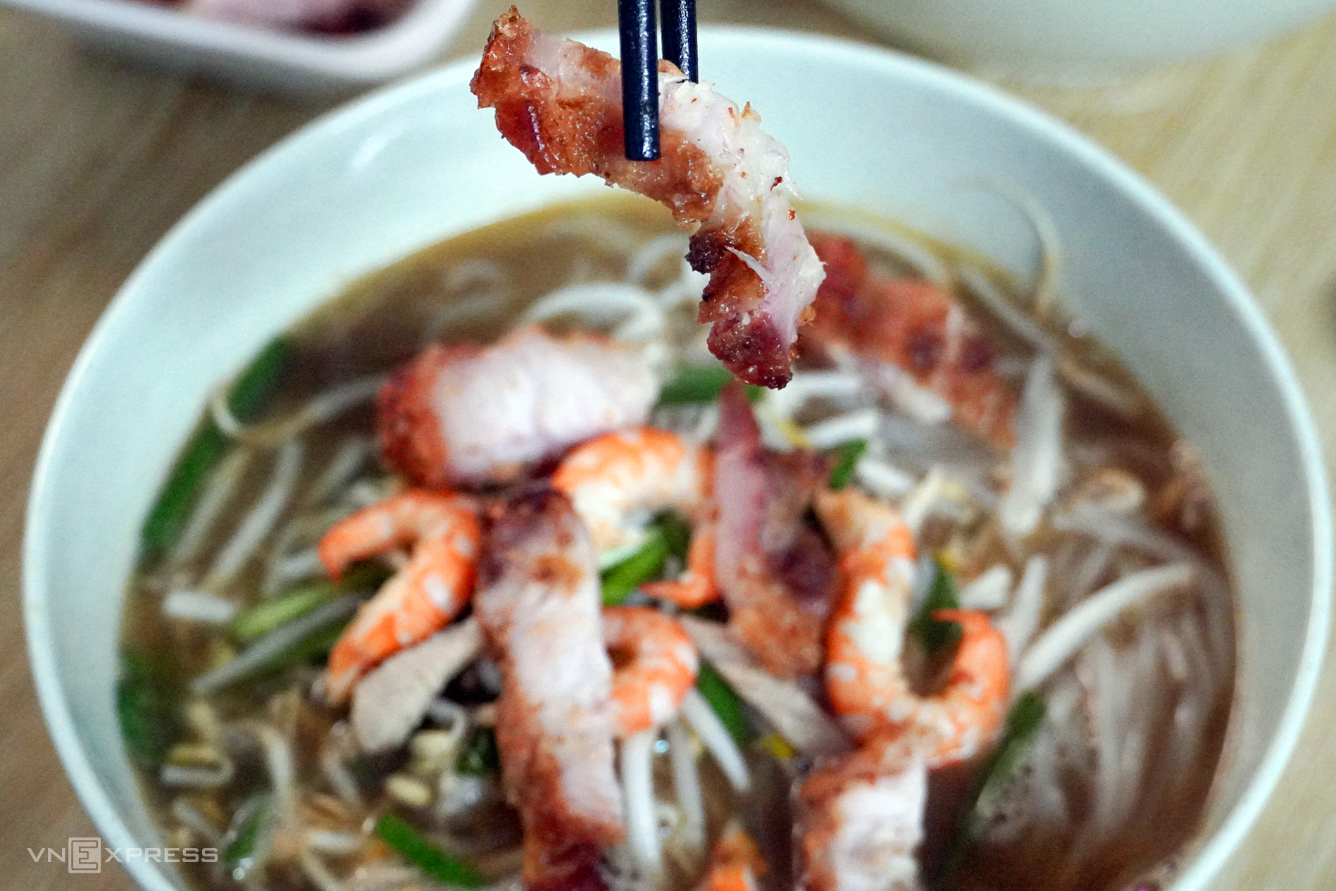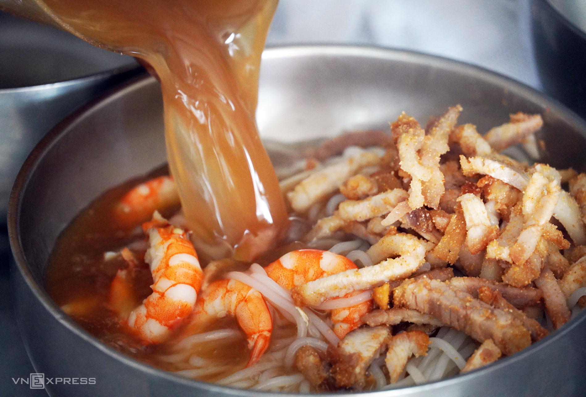 Khác với nhiều quán, bà Ba dùng tôm đất và bì, không có cá. Tôm đất là loài sống tự nhiên ở vùng nước mặn Cà Mau, vị ngọt, thịt chắc.