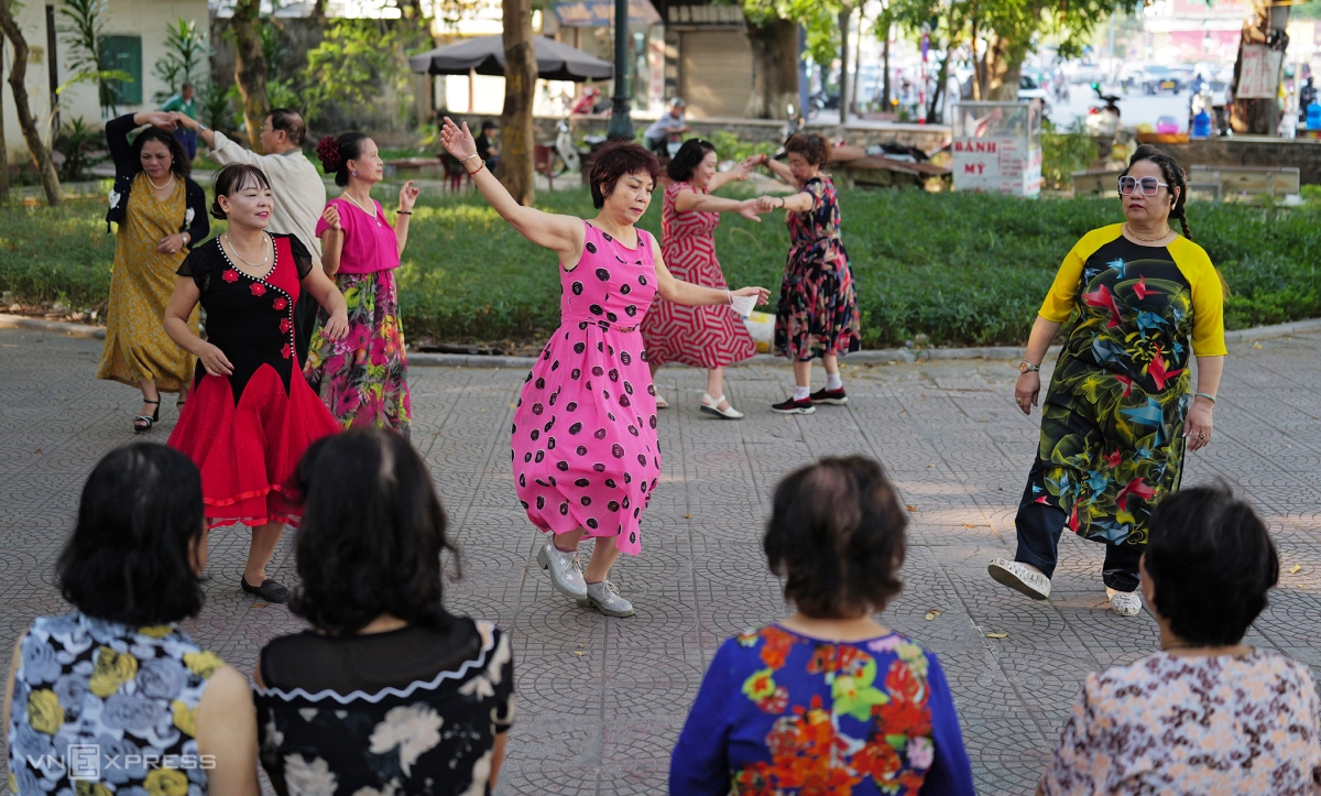 Người dân tập thể dục buổi sáng trong tiết thu dịu mát tại công viên trước cổng Đại học Thủy Lợi, khởi đầu ngày mới bằng những điệu nhảy rộn ràng.