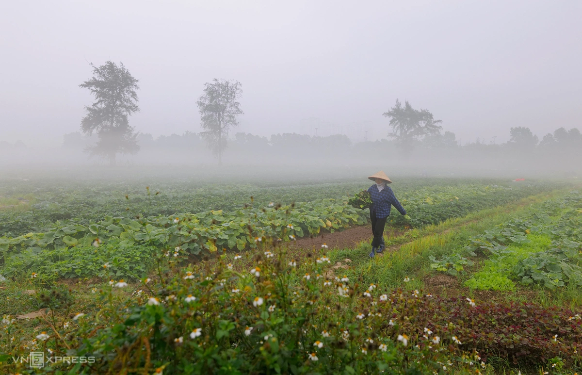 Trong khi đó ở ngoại thành Thanh Oai, màn sương mờ ảo giăng khắp cánh đồng theo bước chân người nông dân lúc sáng sớm, lúc nắng vừa lên.