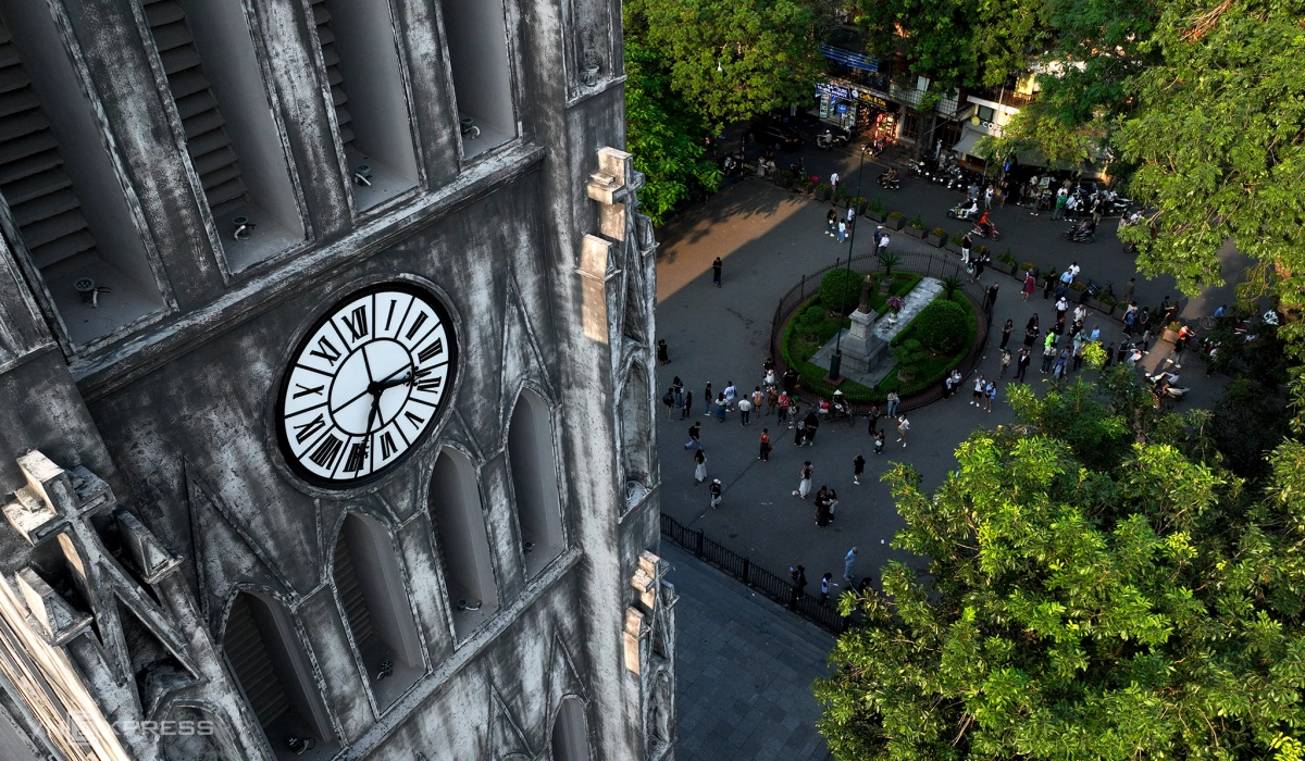 Buổi chiều, nắng phủ lên mái Nhà thờ Lớn và hàng cây. Không gian trong lành thu hút nhiều du khách dạo bộ, hóng gió ở quảng trường.