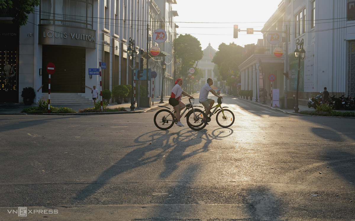Trên các tuyến phố trung tâm, người dân thong thả đạp xe, tận hưởng không khí trong lành buổi sáng sớm.