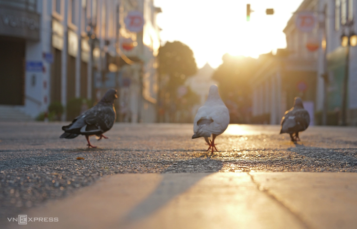 Đàn bồ câu dạo bước trên đường Tràng Tiền lúc sáng sớm, khung cảnh yên bình giữa lòng thành phố khi ngày mới bắt đầu.