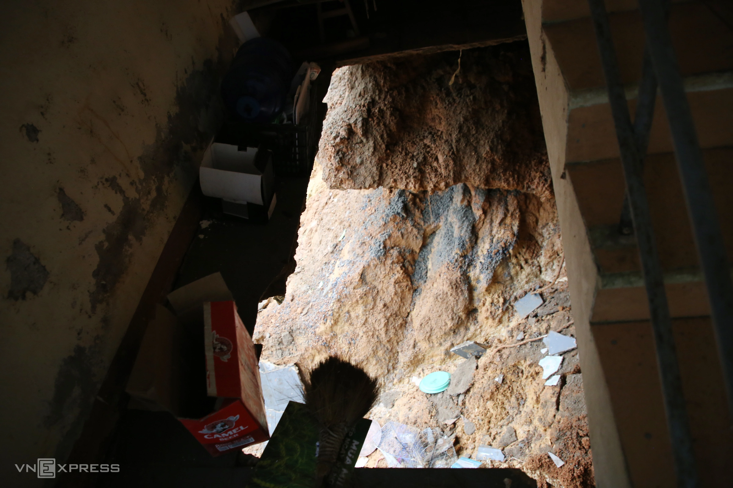 Một người dân dùng dây cảnh báo xuống đường hầm ngôi nhà. Phía trước nhà còn nguyên vẹn, song phía sau thì nứt toác