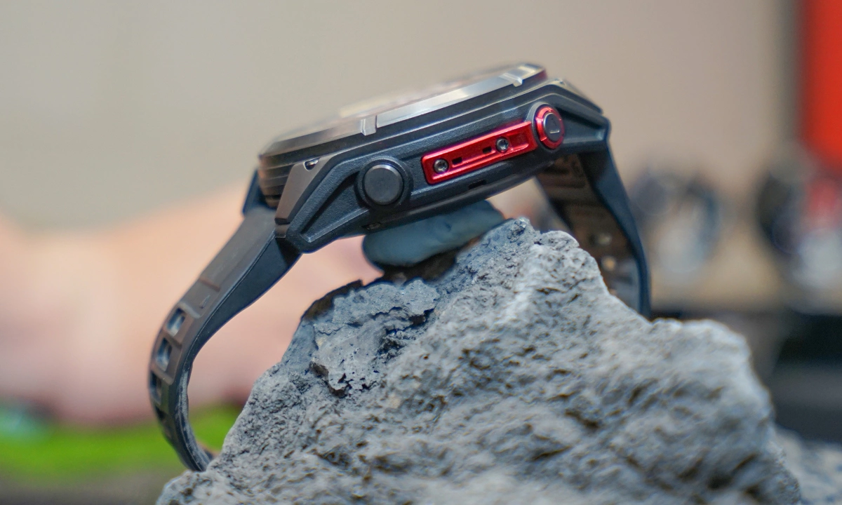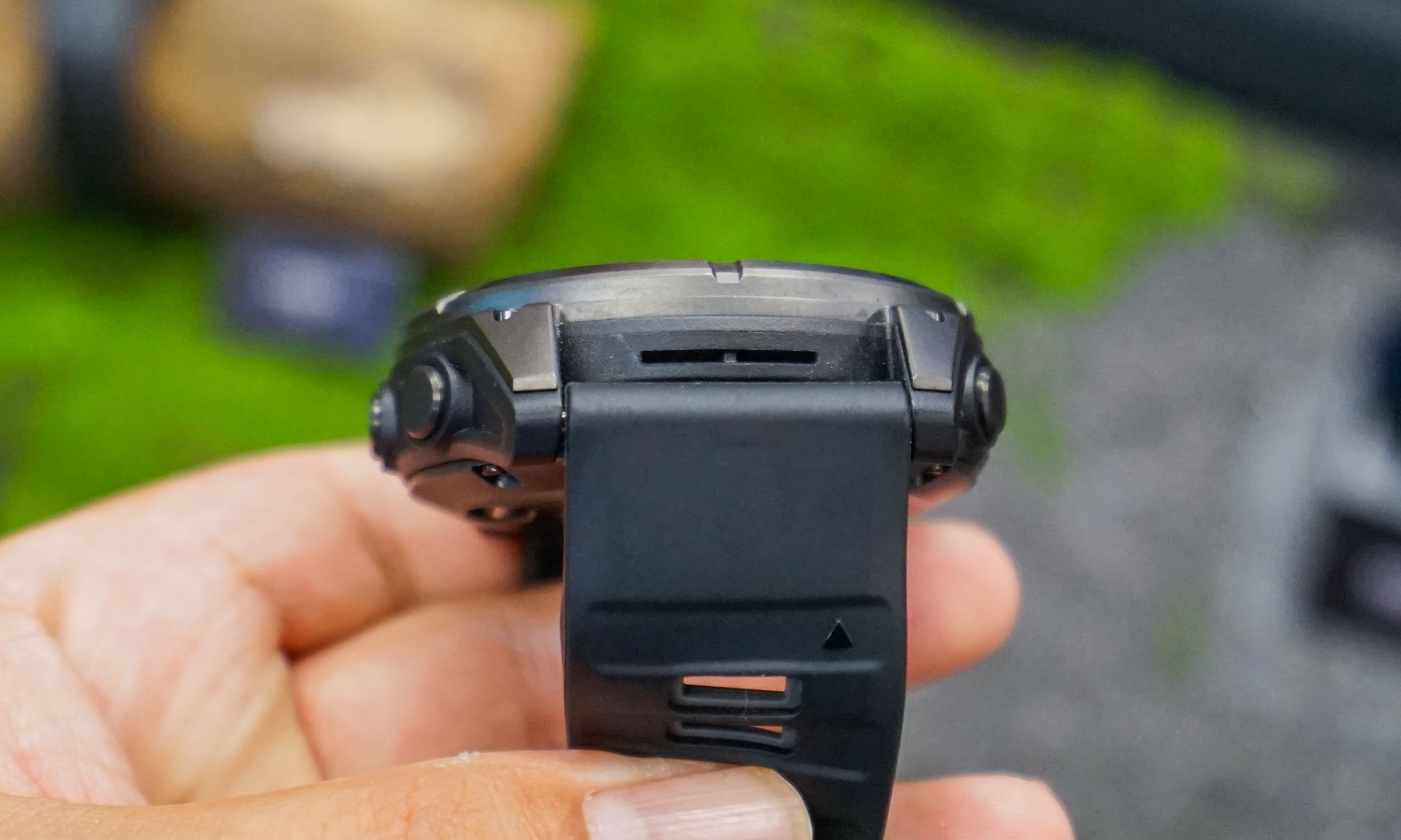 Cạnh trên là nơi đặt đèn pin, sẽ phát ánh sáng đỏ nhấp nháy khi cần phát tín hiệu SOS hoặc phát ánh sáng trắng và đỏ luân phiên theo nhịp vung tay giúp dễ nhận diện trong đêm. Cạnh dưới đặt loa ngoài. Smartwatch dùng dây silicon với kích thước 26 mm, cao hơn so với dây 20 và 22 mm thường thấy. Garmin sử dụng chất liệu titan cho phần viền trên cùng mặt kính sapphire chất lượng cao.