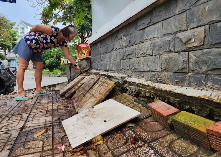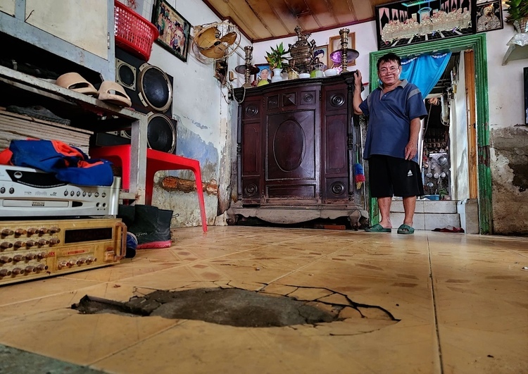 Ông Tài nói đã nhiều lần thay nền gạch men nhưng chỉ sau một thời gian lại hư hỏng. Nhà ông nằm gần bờ kênh bị sụt lún từ giữa năm 2023, từng làm hư hại 13 căn hộ, nên cũng chịu ảnh hưởng.