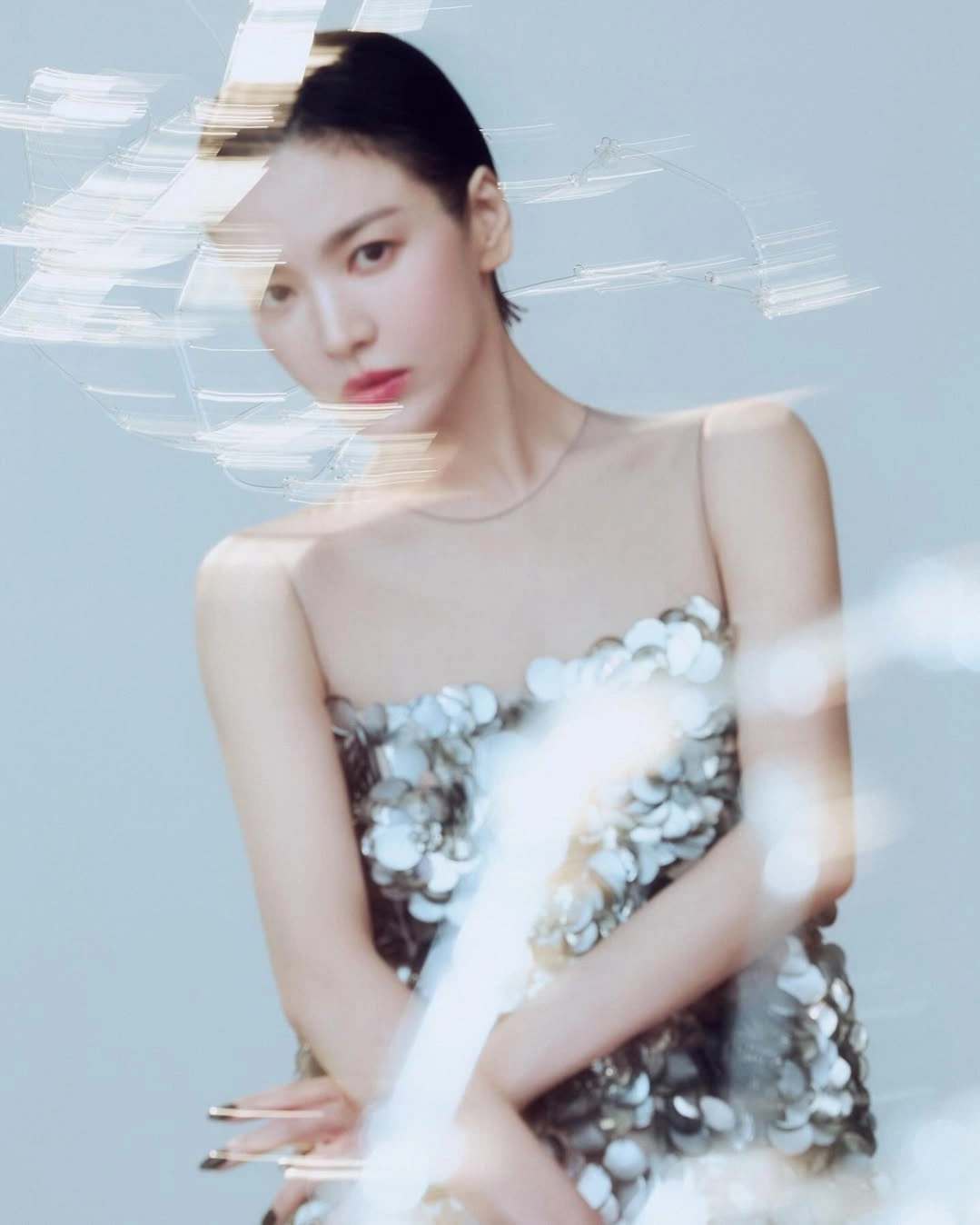 Trong bức ảnh khác, diễn viên xuất hiện với mái tóc dài, mặc váy thun cổ cao của Acne Studios. Trang Sportsworldi đánh giá Hye Kyo "tựa nữ thần", thu hút người xem bằng sức quyến rũ toát ra từ biểu cảm gương mặt.