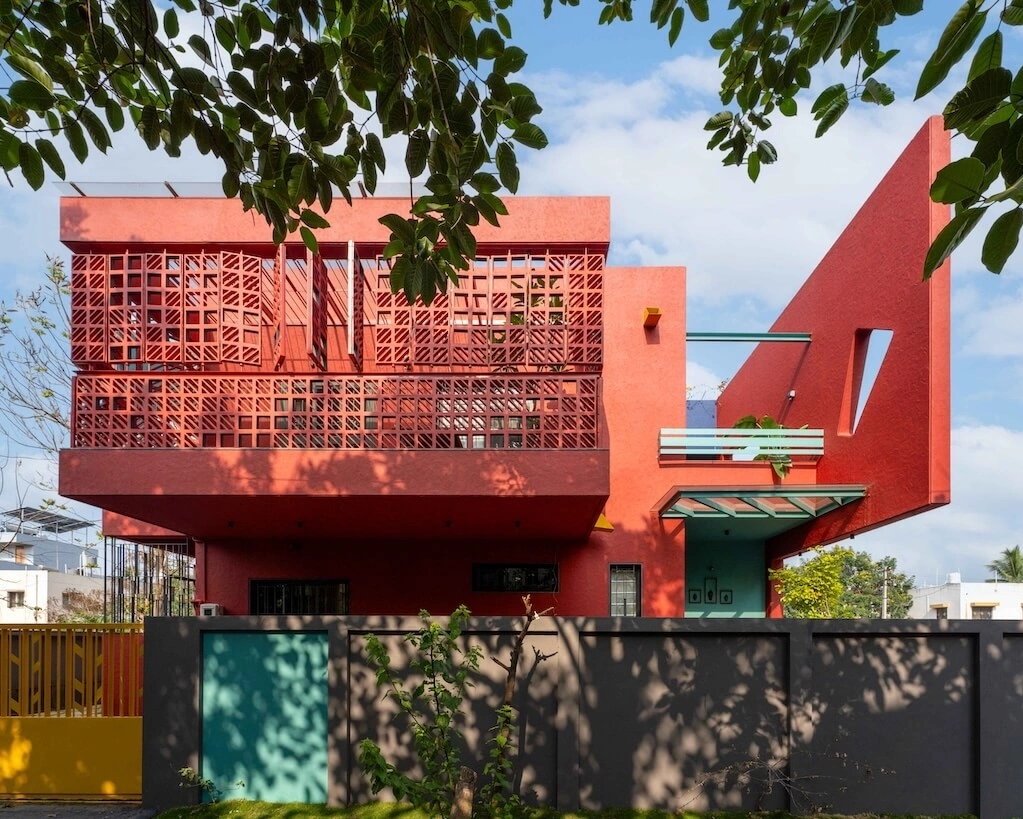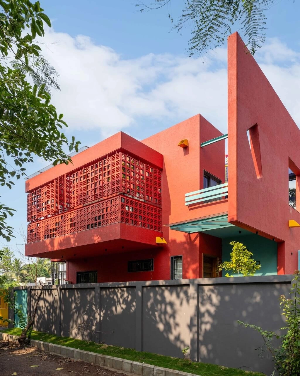 Hình khối căn nhà nổi bật giữa khu dân cư nhờ bố cục hình học, xen kẽ các khoảng cắt xẻ tạo chiều sâu thị giác. Mặt tiền sử dụng tông màu rực rỡ kết hợp hệ gạch bằng đất nung, gợi nhắc đến kiến trúc truyền thống Ấn Độ.