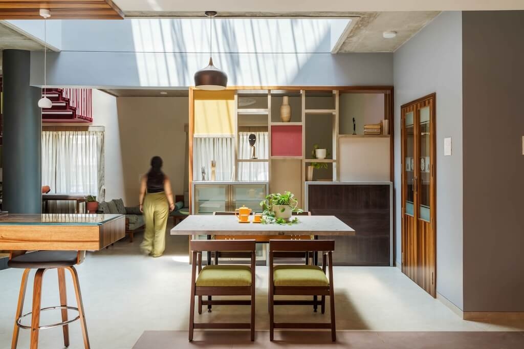 Khoảng thông tầng với giếng trời lấy sáng tự nhiên giúp khu vực ăn uống và sinh hoạt luôn thông thoáng.
