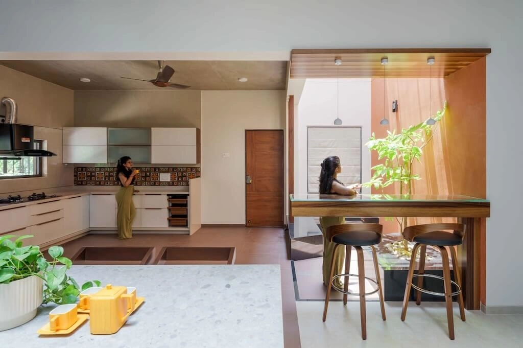 Bếp liên thông với khoảng sân trong, cây xanh dưới giếng trời kết hợp bàn bar tạo góc thư giãn với thiên nhiên.