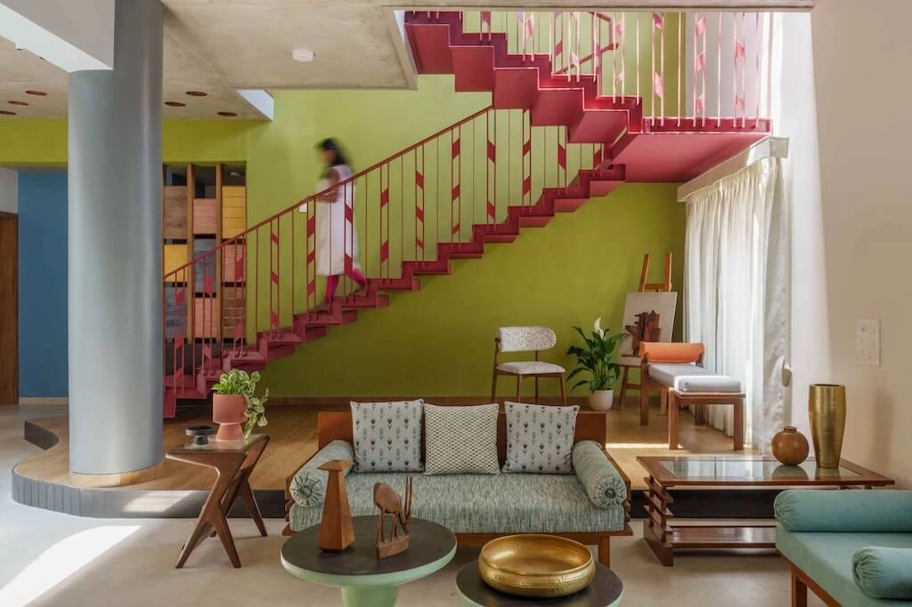 Cầu thang zigzag màu hồng chạy dọc tường xanh lá tạo điểm nhấn trung tâm cho không gian sinh hoạt chung, đồng thời tạo sự phân tách giữa khu vực tiếp khách và khu chức năng phía sau.
