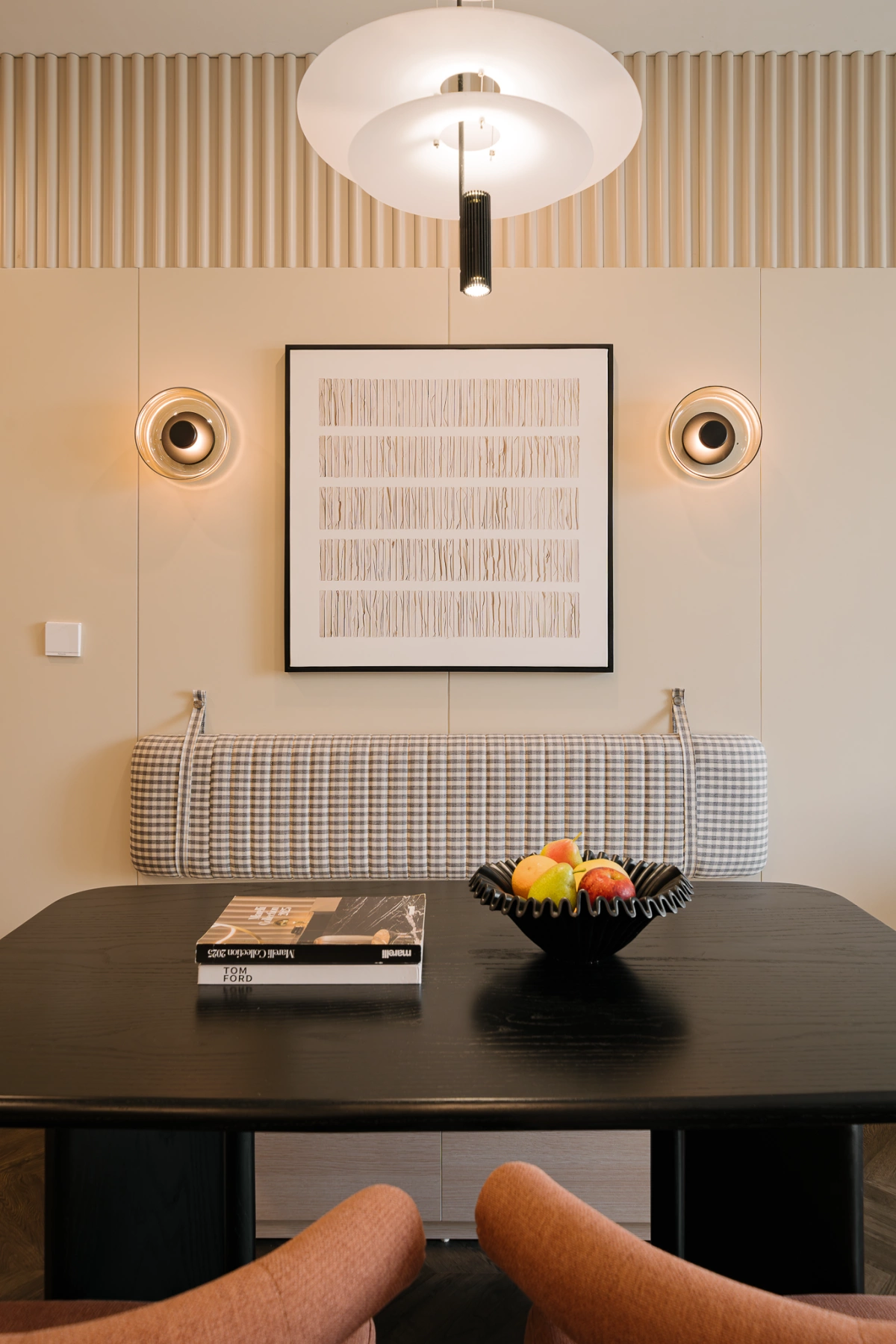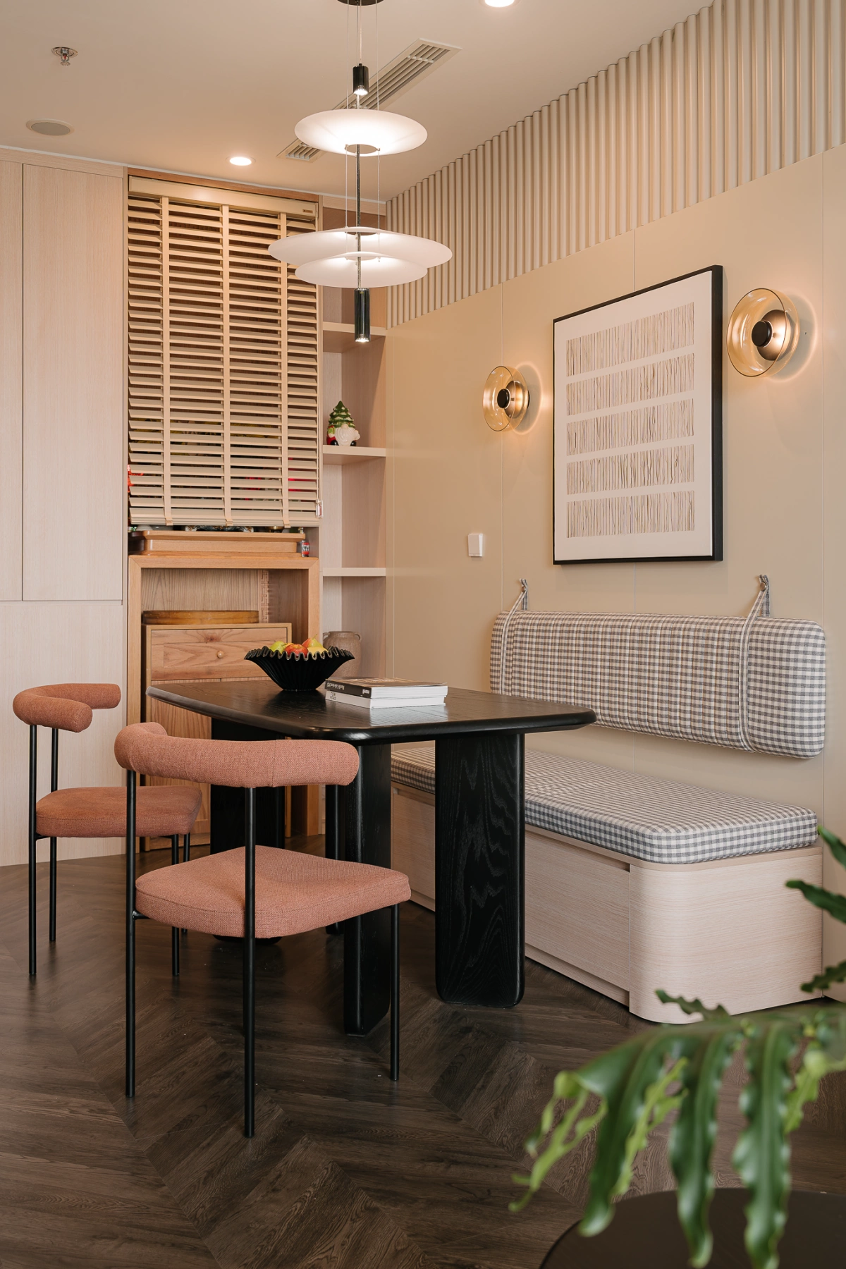 Góc ăn uống tích hợp ghế băng liền tường. Ghế ngồi sử dụng đệm bọc vải kẻ sọc gắn cố định, kết hợp bàn ăn gỗ sơn đen. Hệ đèn thả và tranh treo bố trí cân đối theo trục dọc, giữ tổng thể gọn gàng.