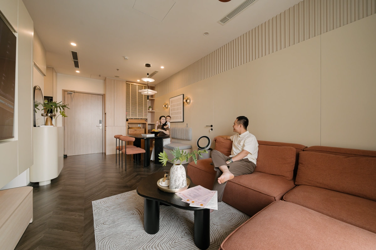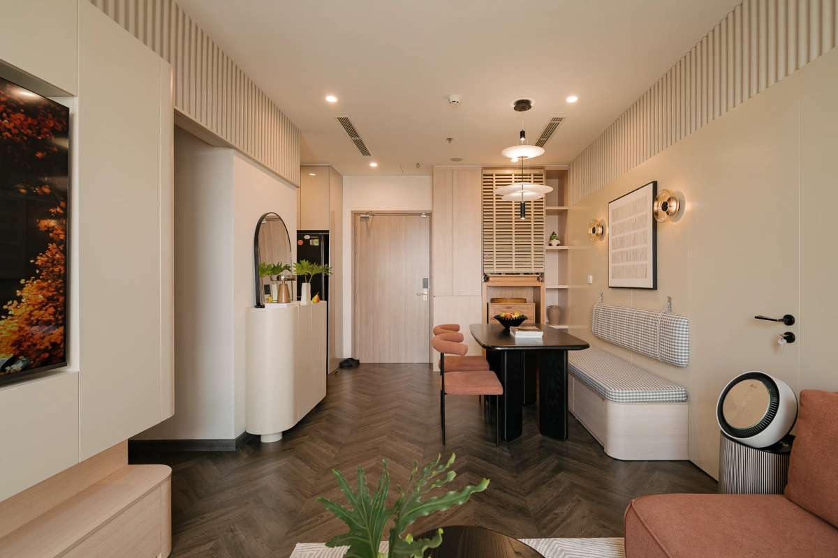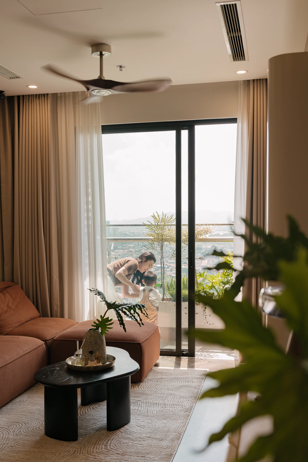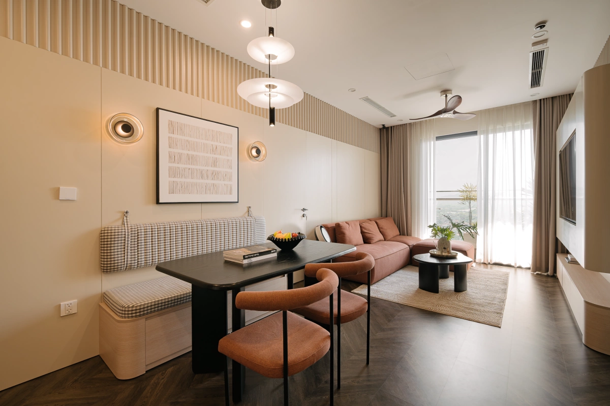 Căn hộ là giải pháp cho những gia đình cần tổ ấm nhỏ gọn, tiện nghi cơ bản và an toàn cho trẻ nhỏ. Không gian có thể dễ dàng làm mới bằng việc thay đổi đồ trang trí hoặc đệm ghế theo mùa, nhờ tông màu nền trung tính.