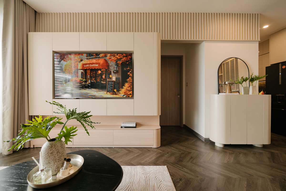 Phòng khách sử dụng hệ tủ tivi âm tường. Mảng tường và nội thất có viền cong chạy xuyên suốt tạo nhịp thị giác, kết nối giữa các khu vực với nhau.