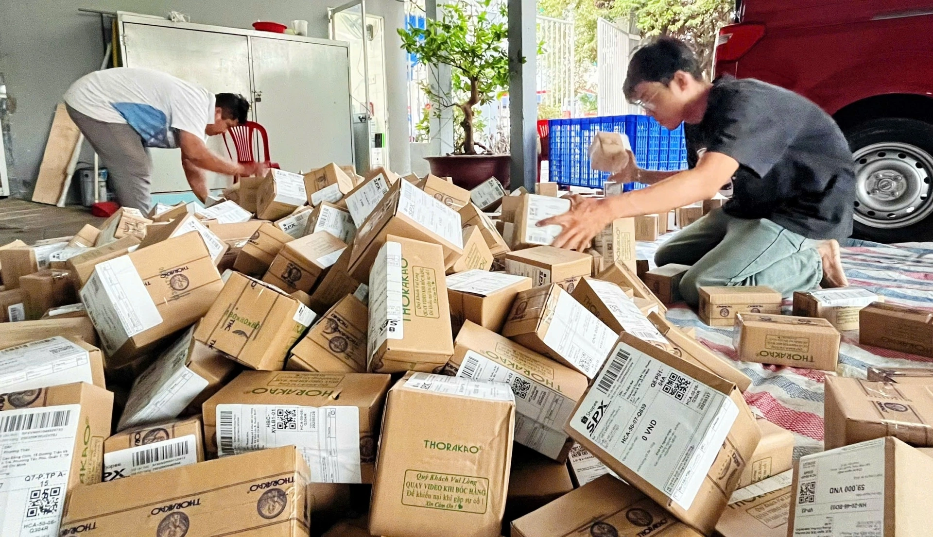 Một buổi trưa đầu tháng 4/2025, hai nhân viên công ty chuyển phát đứng trước tòa nhà biểu tượng của Thorakao trên đường Cách Mạng Tháng Tám (quận 3) để chờ đến giờ vào nhận hàng. Hàng trăm hộp mỹ phẩm đóng gói kỹ lưỡng trải đầy tiền sảnh. Trong 10 phút, tất cả được chất đầy lên xe hàng, đưa về kho phân loại và giao đến hàng chục tỉnh thành.