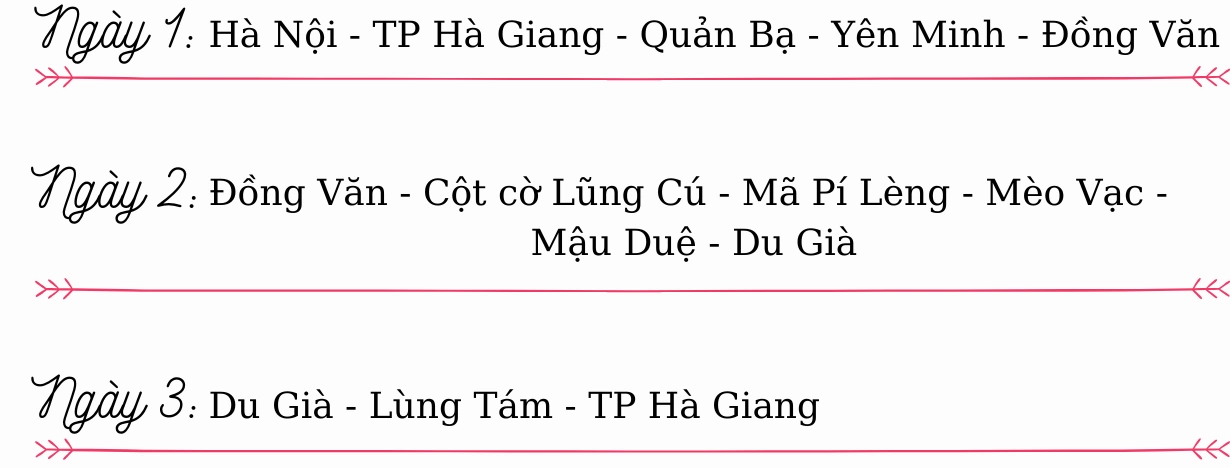 Từ TP Hà Giang, du khách sẽ tiếp tục di chuyển tới thị trấn Đồng Văn, theo hướng quốc lộ 4C. Cung đường này dài khoảng 130 km. Do đường đèo khó đi, thời gian di chuyển, nghỉ chân và ngắm cảnh có thể kéo dài 4, 5 tiếng.