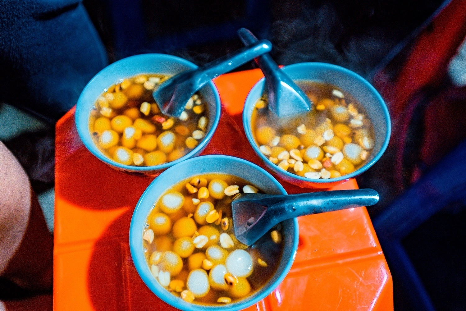 Buổi tối, khi đi dạo trong tiết trời se lạnh, bạn nên thưởng thức một bát thắng dền nóng hổi. Món này được nấu gần giống bánh trôi, tuy nhiên bột nếp được nặn nhỏ hơn và không có nhân. Nước chan được nấu từ đường hoa mai và gừng.