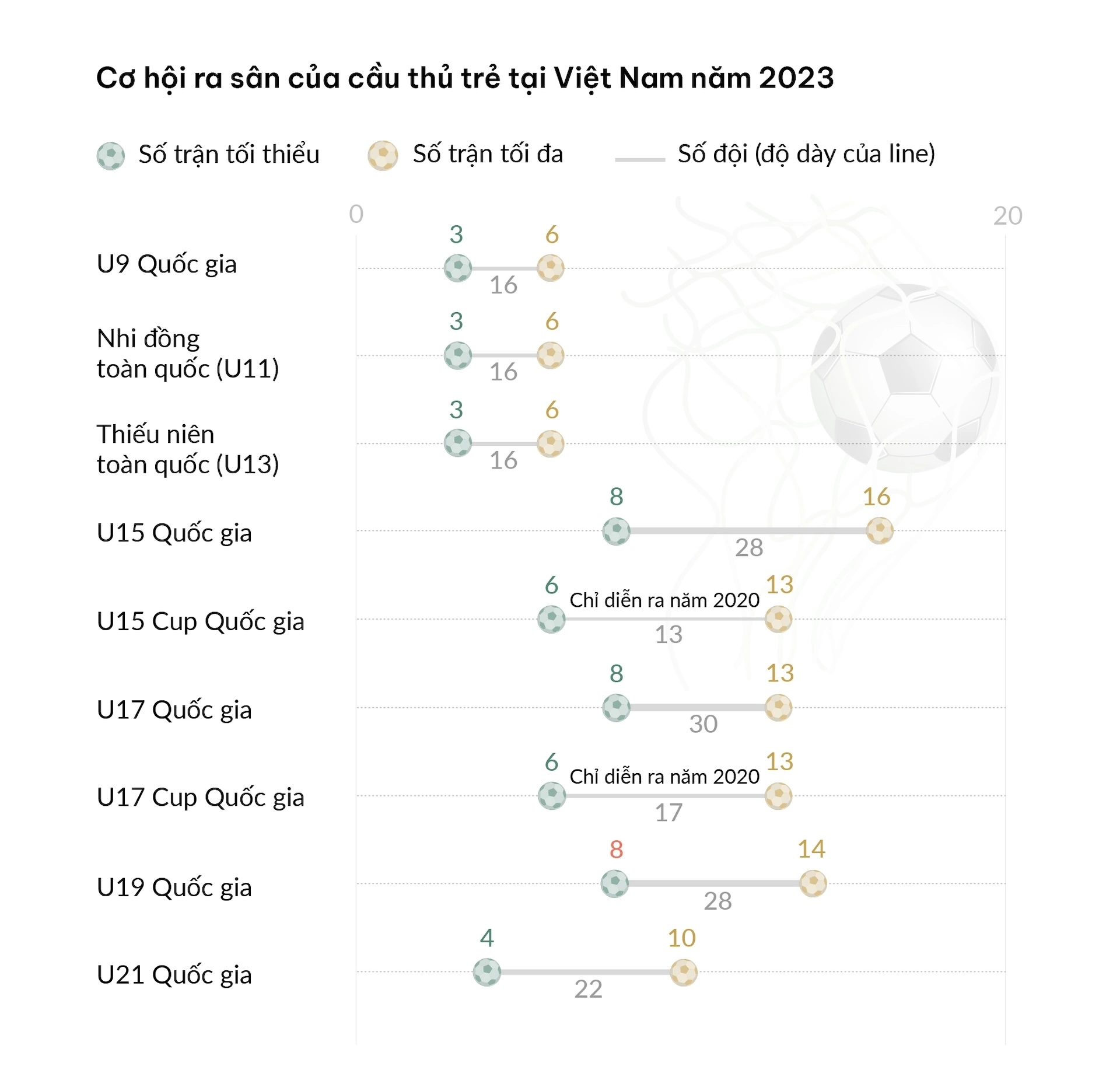 Trong khi triết lý đào tạo thiếu đồng bộ từ trên xuống dưới, cầu thủ trẻ lại thiệt thòi bởi ít thời lượng được ra sân thi đấu để cọ xát, nâng cao kinh nghiệm. Tiền đạo Anh Đức kể khi còn trẻ, cả năm có khi chỉ được đá giải khoảng 10 trận nên "rất khó tiến bộ". Hiện, số trận dành cho cầu thủ trẻ tăng, nhưng chưa thể so với các nước có nền bóng đá phát triển. Nhiều nước có giải riêng cho lứa trẻ, trong khi Việt Nam dù từng quy định một CLB mỗi năm phải dự đủ số giải cho U15, U17, U19, nhưng nhiều đội vẫn bỏ giải trẻ để chạy theo thành tích tại V-League.